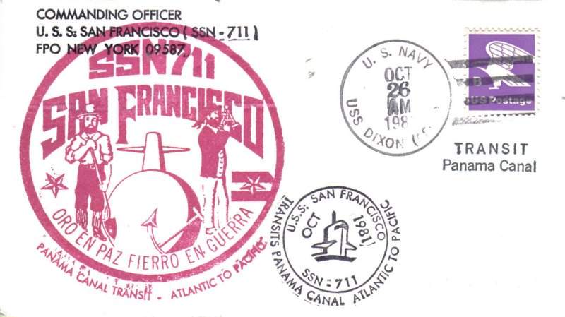![]() | 45k | Commemorative post mark on the occasion of the San Francisco's (SSN-711) Transit of the Panama Canal October 1981, postmarked aboard Subtender Dixon (AS-37), dated 26 October 1981. | Courtesy of Jack Treutle (of blessed memory). | |