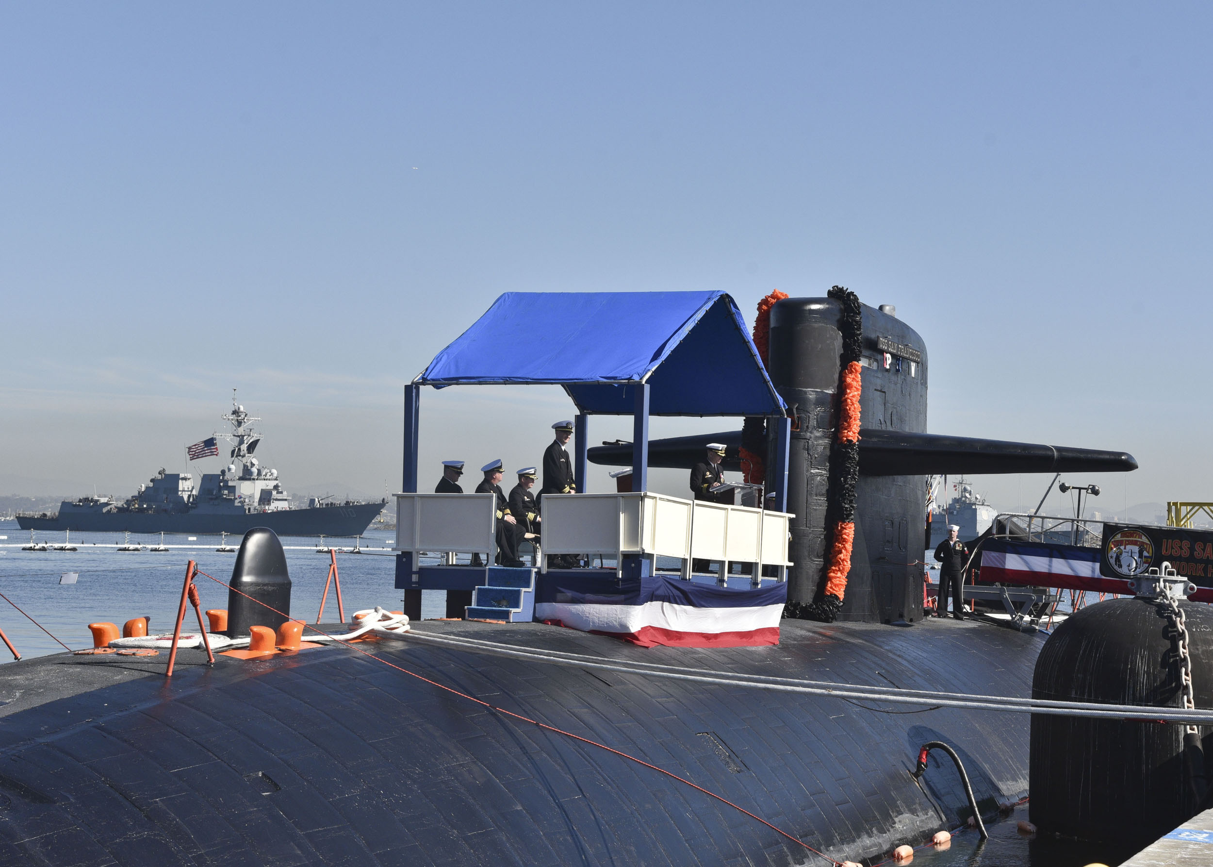 ![]() | 524k | Cmdr. Jeff Juergens, commanding officer of the fast attack submarine San Francisco (SSN-711), delivers remarks during a change of command and farewell ceremony on Naval Base Point Loma on 4 November 2016. The San Francisco is scheduled to shift homeports to Norfolk, Va. to begin a two year conversion process to become a moored training ship at the Nuclear Power Training Unit in Charleston, S.C. | USN photo # 161104-N-TW634-0035 by Petty Officer 2nd Class Derek Harkins, courtesy of navy.mil. | |