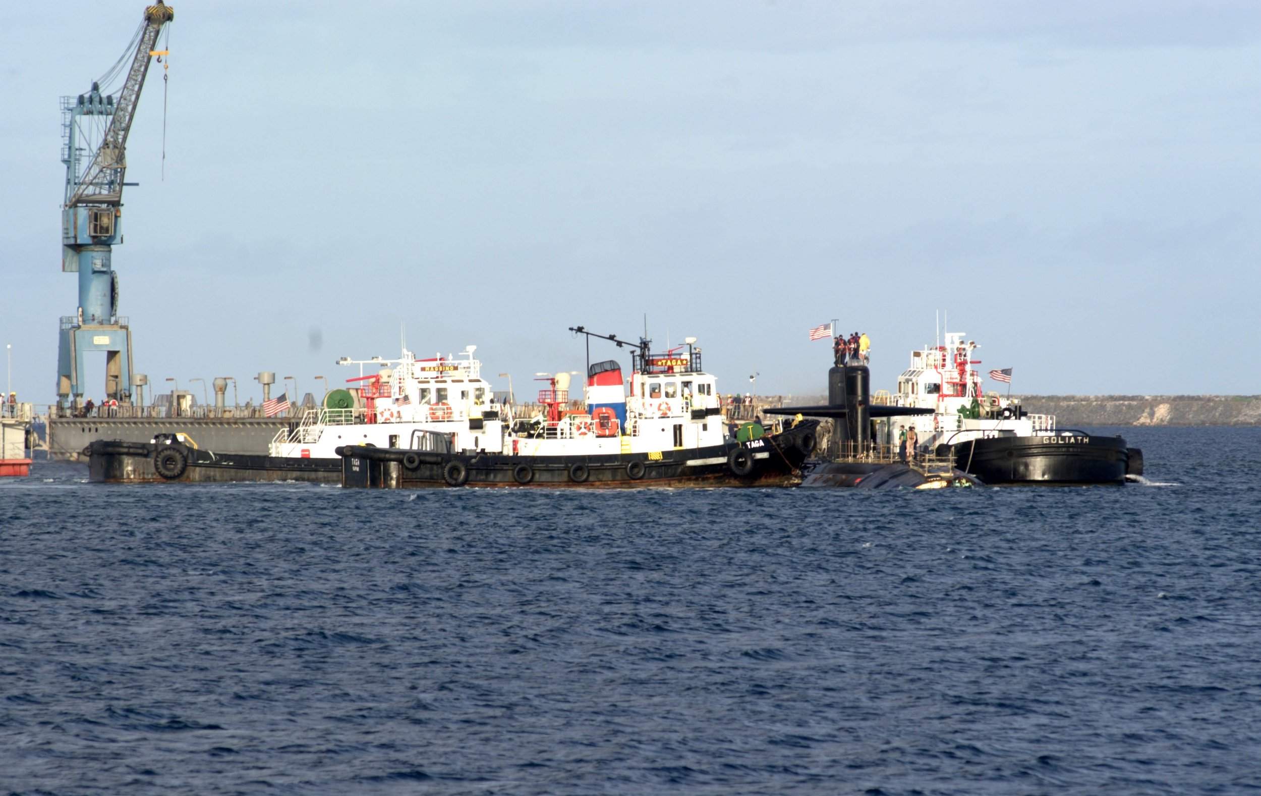 ![]() | 287k | The attack submarine San Francisco (SSN-711) is escorted into dry dock by tugs Taga, Goliath and Magsino in Apra Harbor Guam. | USN photo # N-4658L-056 by Photographer's Mate 2nd Class Mark Allen Leonesio, courtesy of news.navy.mil. | |