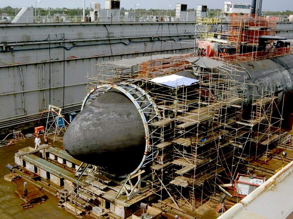 ![]() | 110k | The attack submarine San Francisco (SSN-711) is shown in dry dock in Apra Harbor, Guam, 8 May 2005 having repairs made on its damaged bow. A new large steel dome about 20 feet high and 20 feet in diameter was put in the place of the damaged bow. | USN photo # N-0000X-001 courtesy of news.navy.mil. | |