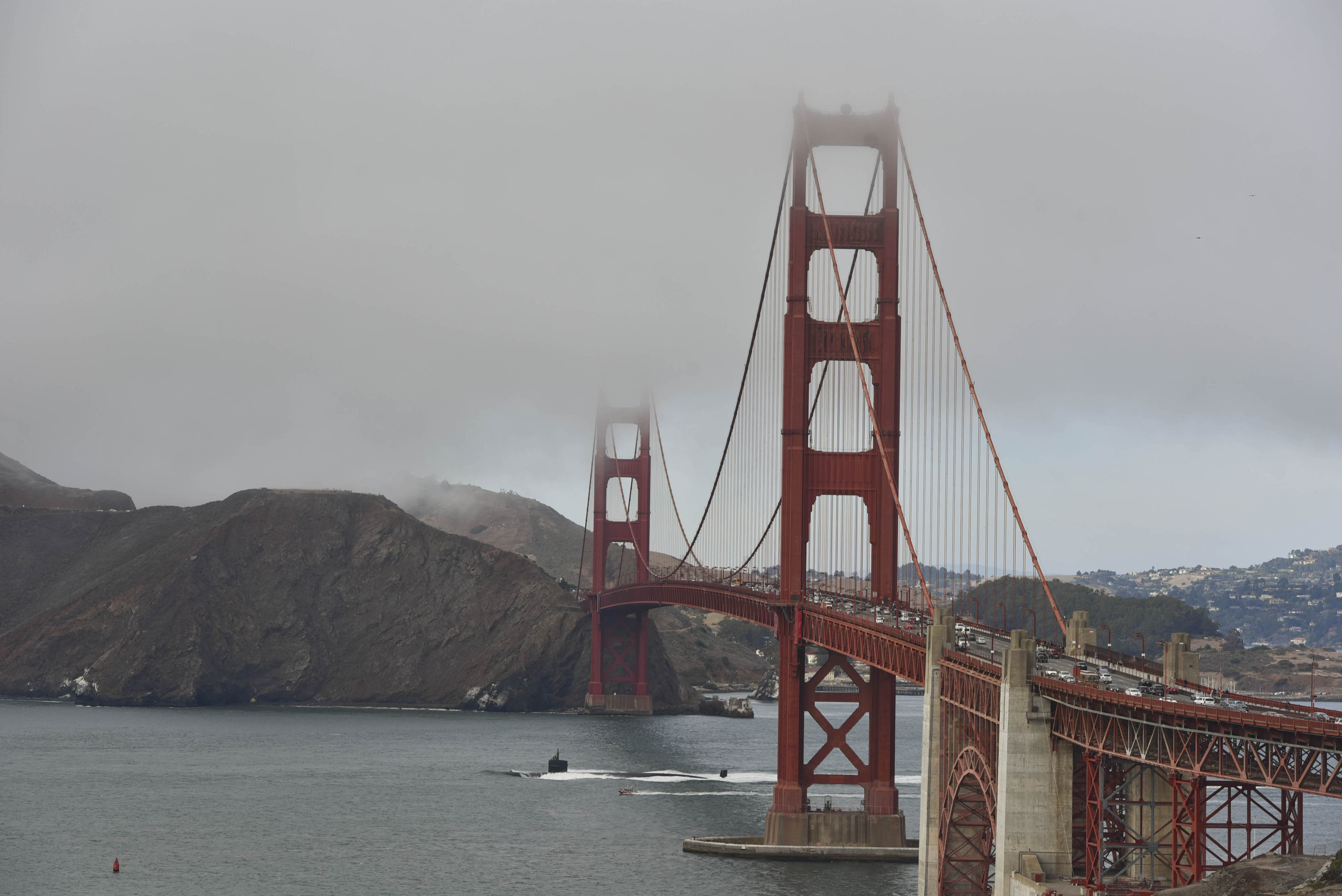 ![]() | 764k | The attack submarine San Francisco (SSN-711) transits under the Golden Gate bridge as it departs San Francisco Bay. San Francisco is returning to her homeport at Naval Base Point Loma in San Diego to officially conclude her final deployment, 12 October 2016. | USN photo # 161012-N-UK333-0080 by Petty Officer 1st Class Ronald Gutridge, courtesy of navy.mil. | |