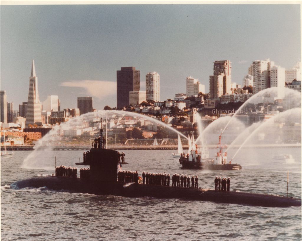 ![]() | 120k | With an accompanying spritz from water boats to welcome her, the San Francisco (SSN-711) meets her namesake port in 1984, during Fleet Week. | Official USN photo courtesy of Wendell Royce McLaughlin Jr. Photo i.d. courtesy of Lauren Skaggs. | |