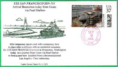 ![]() | 65k | Commemorative post mark on the occasion of the San Francisco's (SSN-711) arriving at Bremerton, Wash. from Guam via Pearl Harbor, 9 September 2005. | Courtesy of Jack Treutle (of blessed memory). | |