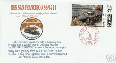 ![]() | 18k | Commemorative post mark & photo inset on the occasion of the San Francisco's (SSN-711) arriving at Bremerton, Wash. from Guam via Pearl Harbor, 9 September 2005. | Courtesy of Jack Treutle (of blessed memory). | |