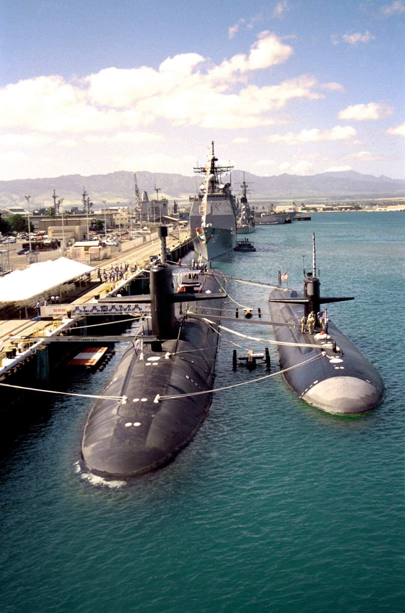 ![]() | 258k | The nuclear-powered strategic missile submarine Alabama (SSBN-731), left, and the nuclear-powered attack submarine San Francisco (SSN-711) are moored together at a pier in front of the guided missile cruiser Chosin (CG-65) during the change of command ceremony for the commander, U.S. Pacific Fleet on 1 February 1991. | Official USN photo # DN-SC-92-08698, by OS2 John Bouvia, from the Department of Defense Still Media Collection, courtesy of dodmedia.osd.mil. & submitted by Bill Gonyo. | |