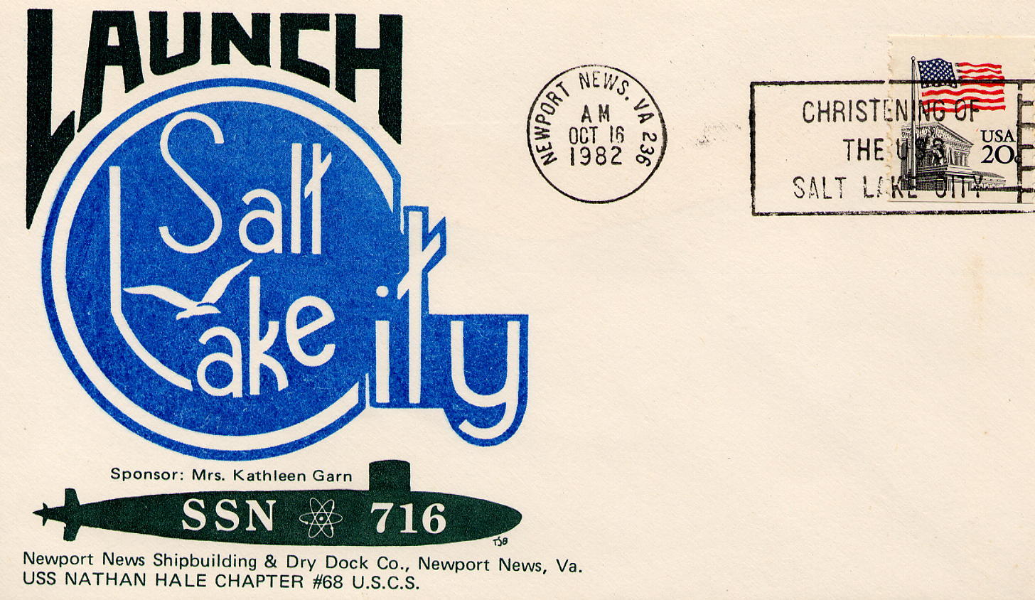 236k | Salt Lake City (SSN-716) launch cachet on 16 October 1982. | USN photo courtesy of Scott Koen & ussnewyork.com. | |