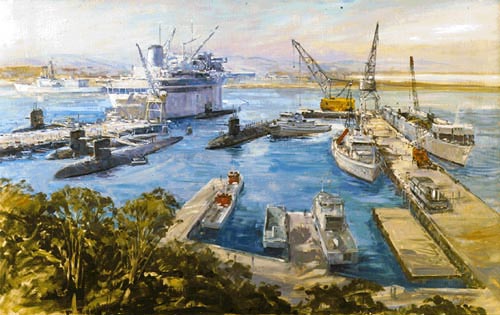 McKee (AS-42) for Subron 7: Dixon (AS-37) for Subron 3: Among the subs were the: Gudgeon (SS-567): Albacore (AGSS-569): Blueback (SS-581): Permit (SSN-594): Plunger (SSN-595): Pollack (SSN-603) Haddo (SSN-604): Guardfish (SSN-612): Haddock (SSN-621): Sturgeon (SSN-637): Gurnard (SSN-662) : Hawkbill (SSN-666): Pintado (SSN-672): Drum (SSN-677): William H. Bates (SSN-680): La Jolla (SSN-701): Portsmouth (SSN-707) & Salt Lake City (SSN-716). | Ballast Point, San Diego John Charles Roach 1986.5 Oil on Masonite, 1986, courtesy of the USNHC, # 88-163-CR. Text contributed by OMC J. Reid Pallady USNR-RET & QM2(SS)David Johnston (USN, retired) |
