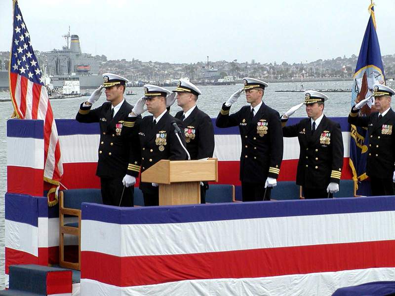 ![]() | 65k | In an early morning ceremony on 3 April 2001, at Naval Base Point Loma, the command of Salt Lake City (SSN-716) shifted hands as Cmdr. Stephen Marr relieved Cmdr. William Hoeft. Rear Adm. C. H. Griffiths, Jr., Commander Submarine Group Nine, served as Guest Speaker for the event. The official party renders honors to the National Ensign during the Change of Command Ceremony of Salt Lake City. Party members include from left to right, Cmdr. Stephen Marr, Commanding Officer USS Salt Lake City (SSN 716); Lt. Cmdr Moises Deltorro, Executive Officer Salt Lake City; Rear Adm. Charles Griffiths, Jr., Commander Submarine Squadron Nine; Cmdr. William Hoeft, Jr., Deputy Commander Submarine Squadron Eleven, Capt. Bruce Smith, Commander Submarine Squadron Eleven and Cmdr. Johnna Precup, Submarine Squadron Eleven Chaplain. | USN photo by JO1 (SCW) Robert Feinberg, ComSubPac & submitted by Bill Gonyo. | |