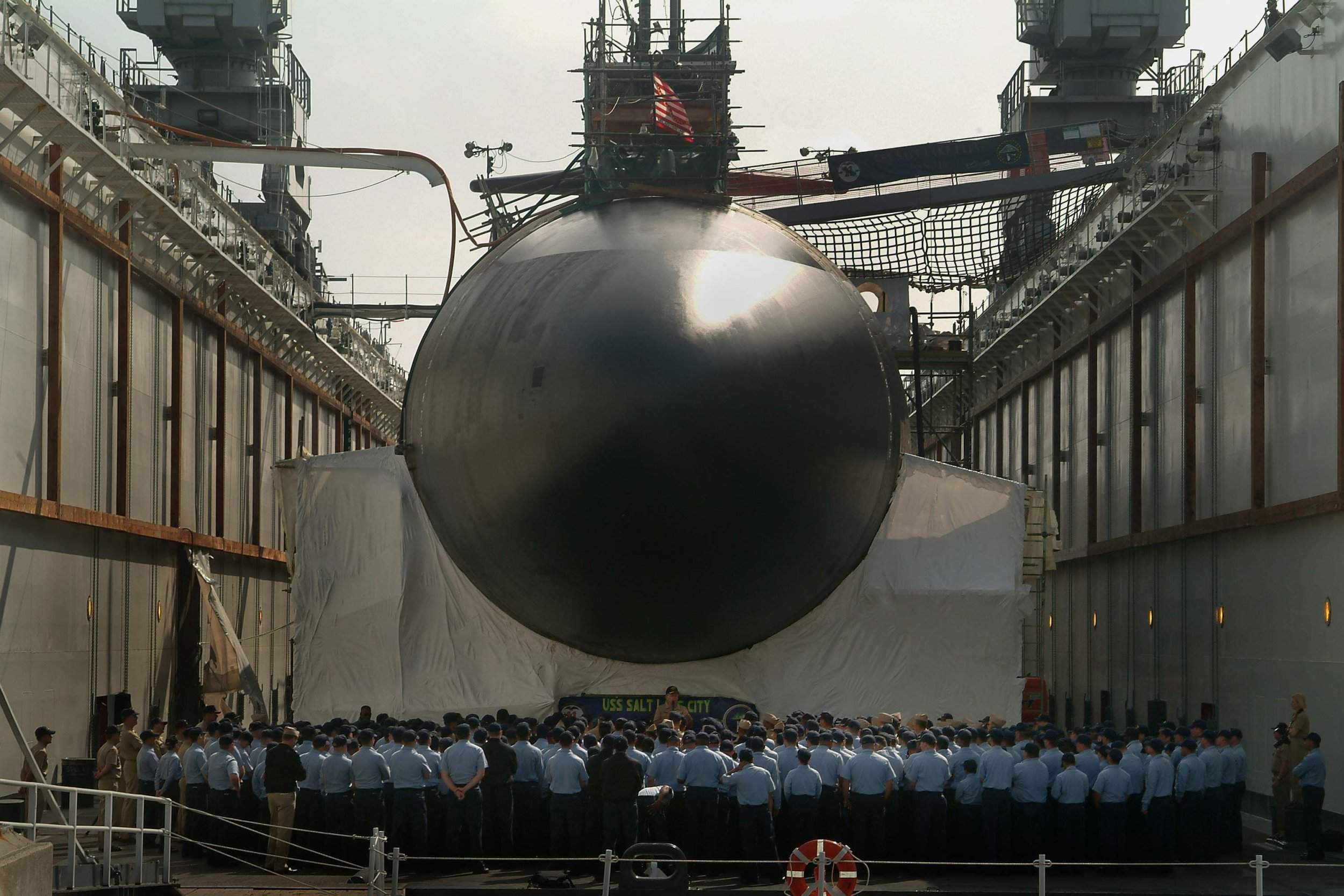 ![]() | 100k | The crew of the Salt Lake City (SSN-716) stand in ranks during the boat's inactivation ceremony on board Naval Base Point Loma. | USN photo # N-1577S-041, by Photographer's Mate 3rd Class Timothy F. Sosa, courtesy of news.navy.mil. | |