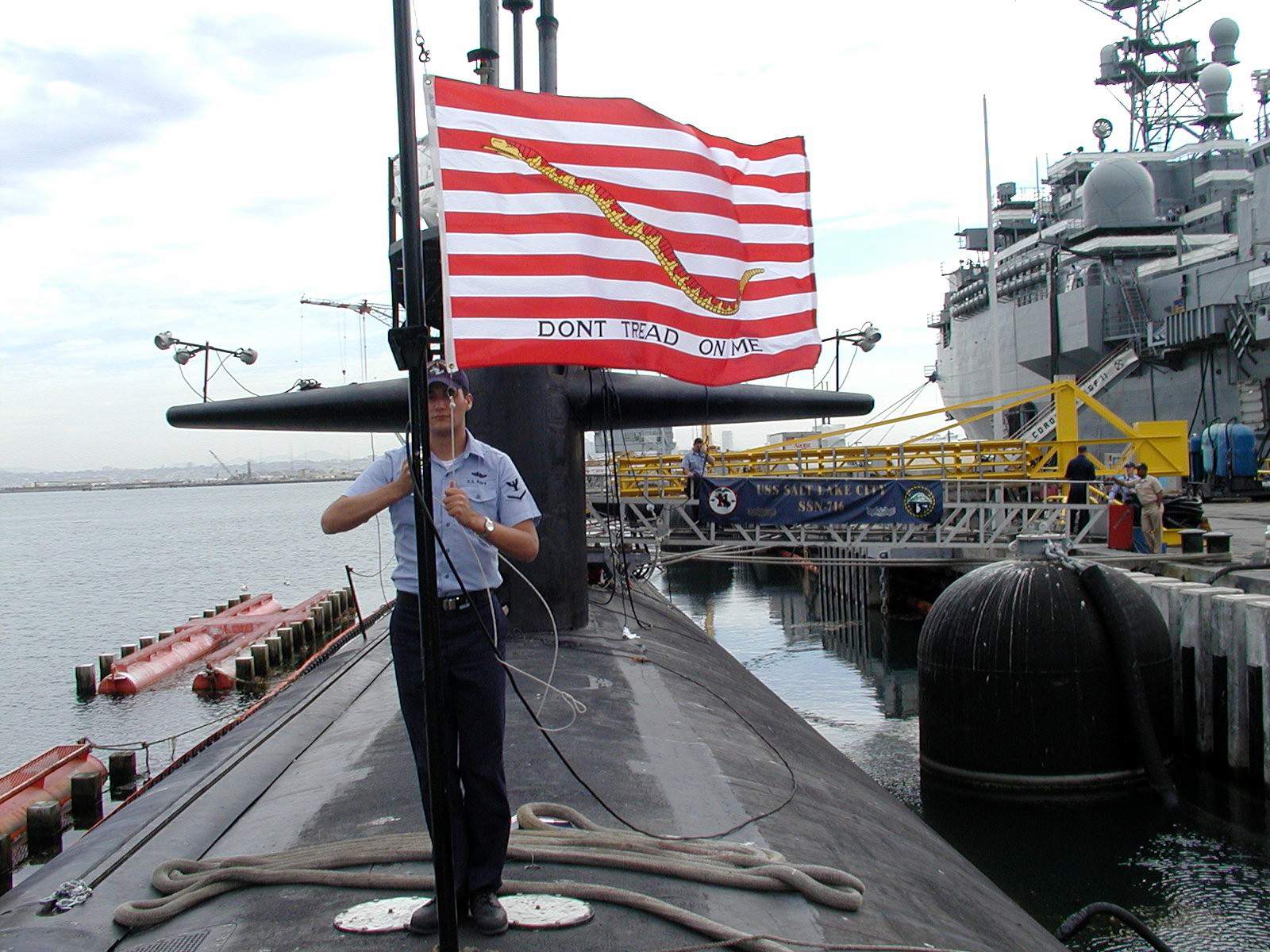 ![]() | 261k | Aboard the Salt Lake City (SSN-716) September 11, 2002. A Sailor hoists the "Navy Jack" aboard the Salt Lake City in memory of the September 11 attacks on America. Under direction of the Secretary of the Navy, Gordon R. England, all U.S. Navy ships will fly the "Navy Jack" in place of the "Union Jack" for the duration of the war on terrorism. The "Navy Jack" is a flag consisting of a rattlesnake superimposed across thirteen horizontal alternating red and white stripes, with the motto, "Don’t Tread on Me." | USN photo # N-0000X-001 courtesy of news.navy.mil. | |