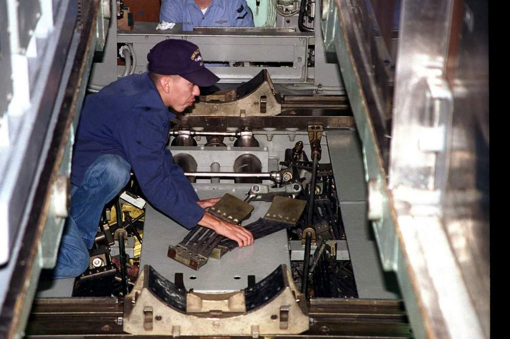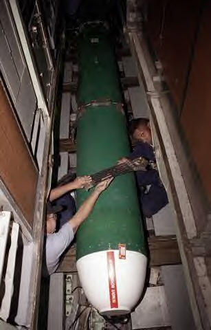 ![]() | 51k | Torpedoman's Mate Third Class (SS) Samuel S. Cabrerra (left) passes a lashing strap to TM2 (SS) Jimmie S. Swift III as they safely secure a Tomahawk missile in the torpedo room of the Salt Lake City (SSN-716) during Global Guardian '98 on 27 October 1997. | USN photo # N-7159P-008 by PH2 (NAC) H. Wolfgang Porter, courtesy of news.navy.mil.& submitted by Bill Gonyo. | |