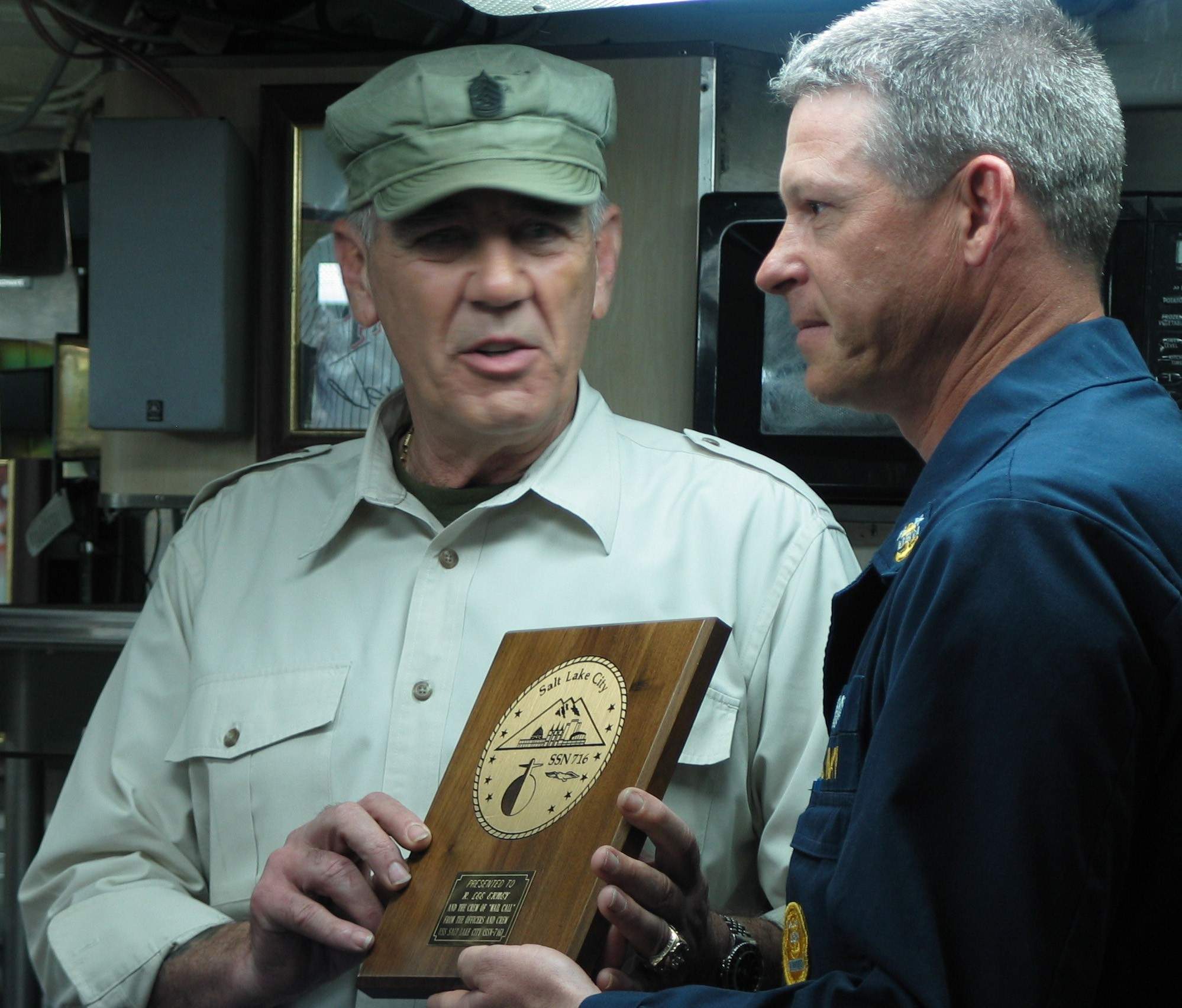 ![]() | 242k | The Chief of the Boat ETCM(SS) Brian Schell presents The Gunny with a Salt Lake City (SSN-716) plaque. R. Lee Ermey and a crew from the History Channel's "Mail Call" embarked Salt Lake City on 10 March 2004 to film an episode of the 30-min. show answering viewer's questions on life aboard an attack submarine at sea. | USN photo by ETC(SS) Jorge L. Pere, courtesy of news.navy.mil. & submitted by Bill Gonyo. | |