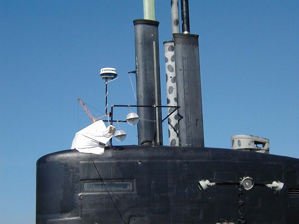 ![]() | 67k | Check out the civvie radar unit on Salt Lake City (SSN-716). Even more interesting are the radar reflectors for use in the harbor... says something about the radar signature of the sail, doesn't it? | USN photo & text courtesy of usspasadena.org. & submitted by Bill Gonyo. | |