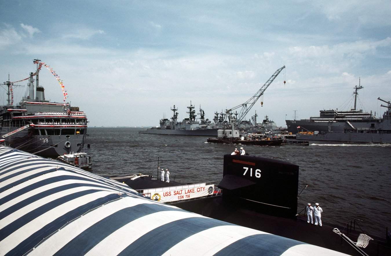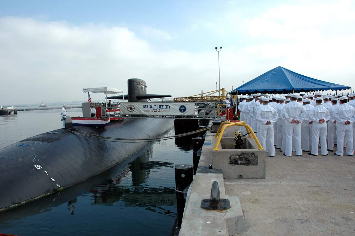![]() | 115k | Crewmen stand at attention on deck during the commissioning ceremony for the nuclear-powered attack submarine Salt Lake City (SSN-716) on 12 May 1984. Moored in front of the Salt Lake City is the submarine tender Emory S. Land (AS-39) with its crew manning the stern rails. Various naval vessels can be seen on the right. | USN photo # DN-ST-84-09331, by PH2 Wujcik, from the Department of Defense Still Media Collection, courtesy of dodmedia.osd.mil. | |