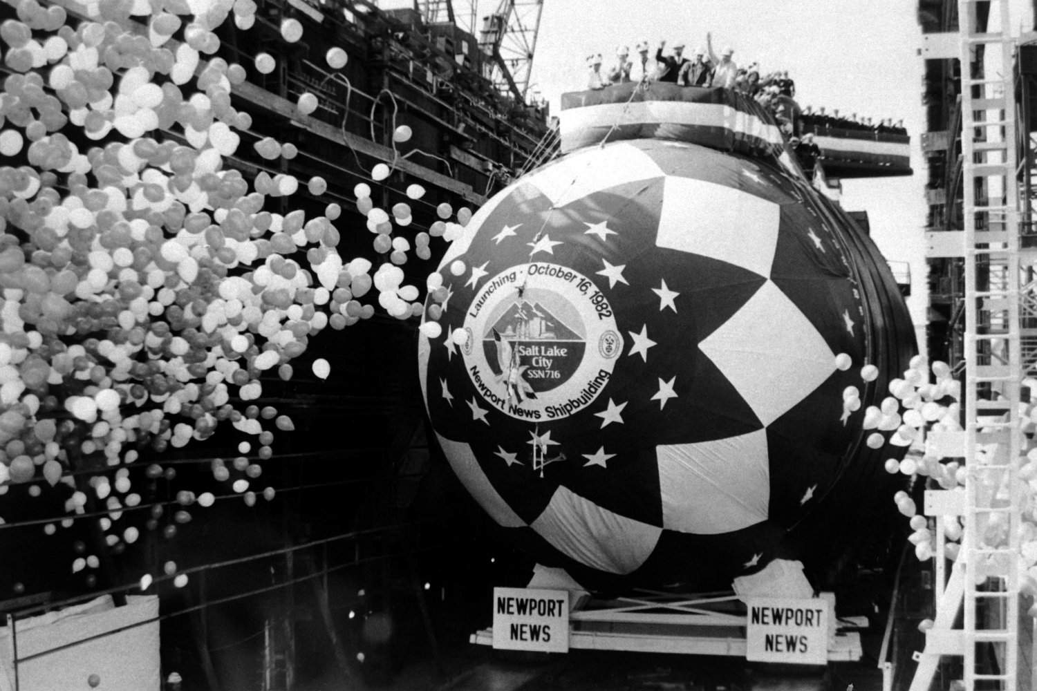 ![]() | 154k | Balloons float skyward as the nuclear-powered attack submarine Salt Lake City (SSN-716) slides down the ways at the conclusion of the launching ceremony on 16 October 1983. | USN photo # DN-SN-83-06084 by Stu Gilman, from the Department of Defense Still Media Collection, courtesy of dodmedia.osd.mil. | |