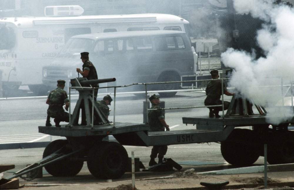 ![]() | 59k | Marines fire a ceremonial cannon salute during the commissioning ceremony for the nuclear-powered attack submarine Salt Lake City (SSN-716). | USN photo # DN-ST-84-09349, by PH2 Wujcik, from the Department of Defense Still Media Collection, courtesy of dodmedia.osd.mil. | |