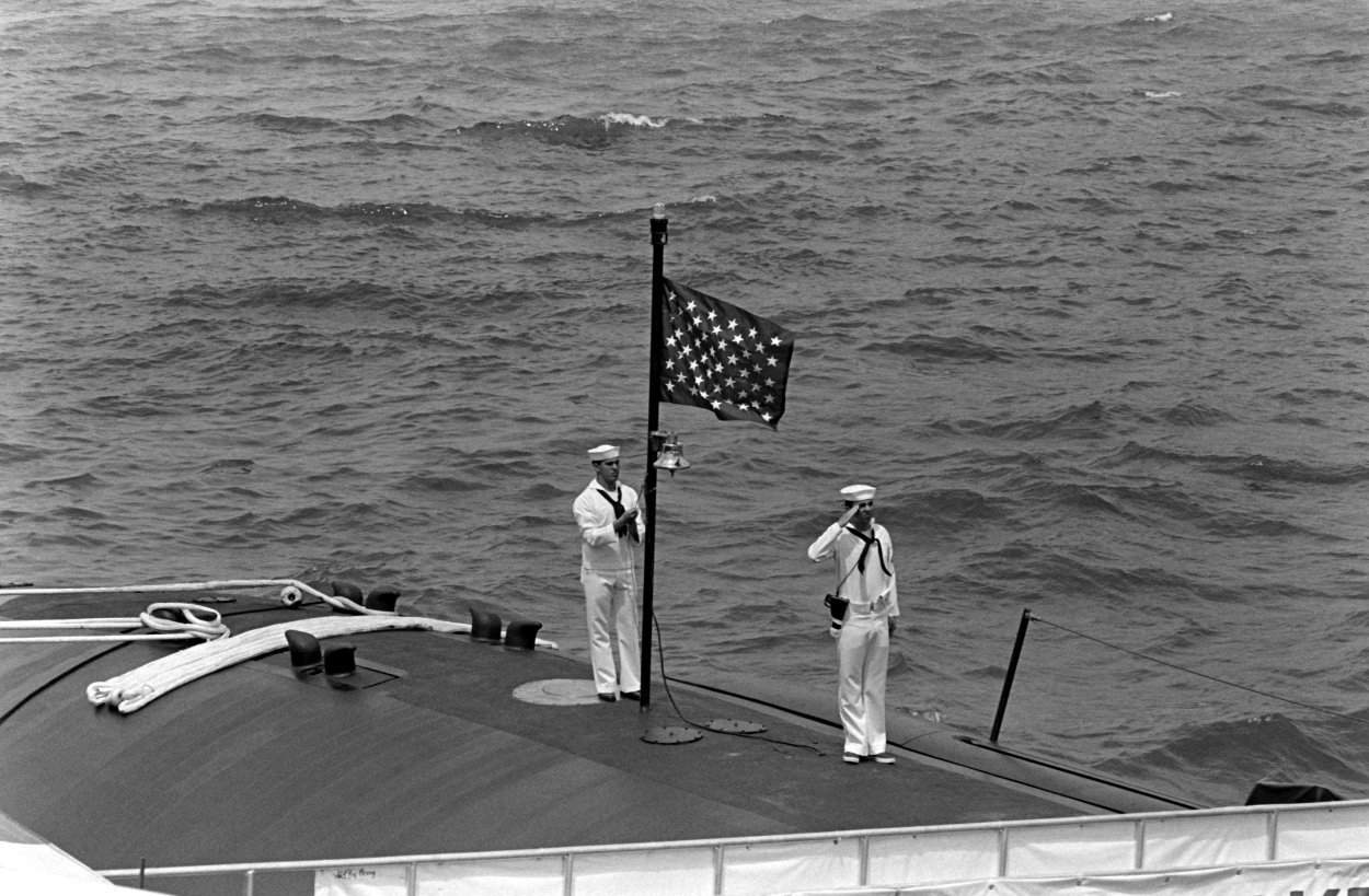 ![]() | 121k | Crew members raise the union jack aboard the nuclear-powered attack submarine Salt Lake City (SSN-716) during the ship's commissioning ceremony. | USN photo # DN-ST-84-09383, by PH2 Wujcik, from the Department of Defense Still Media Collection, courtesy of dodmedia.osd.mil. | |