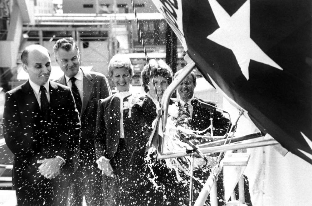![]() | 94k | Kathleen Garns, sponsor, breaks the traditional bottle of champagne across the bow of the nuclear-powered attack submarine Salt Lake City (SSN-716) during the christening ceremony on 16 October 1982. | USN photo # DN-SC-84-10130, by Stu Gilman, from the Department of Defense Still Media Collection, courtesy of dodmedia.osd.mil. | |