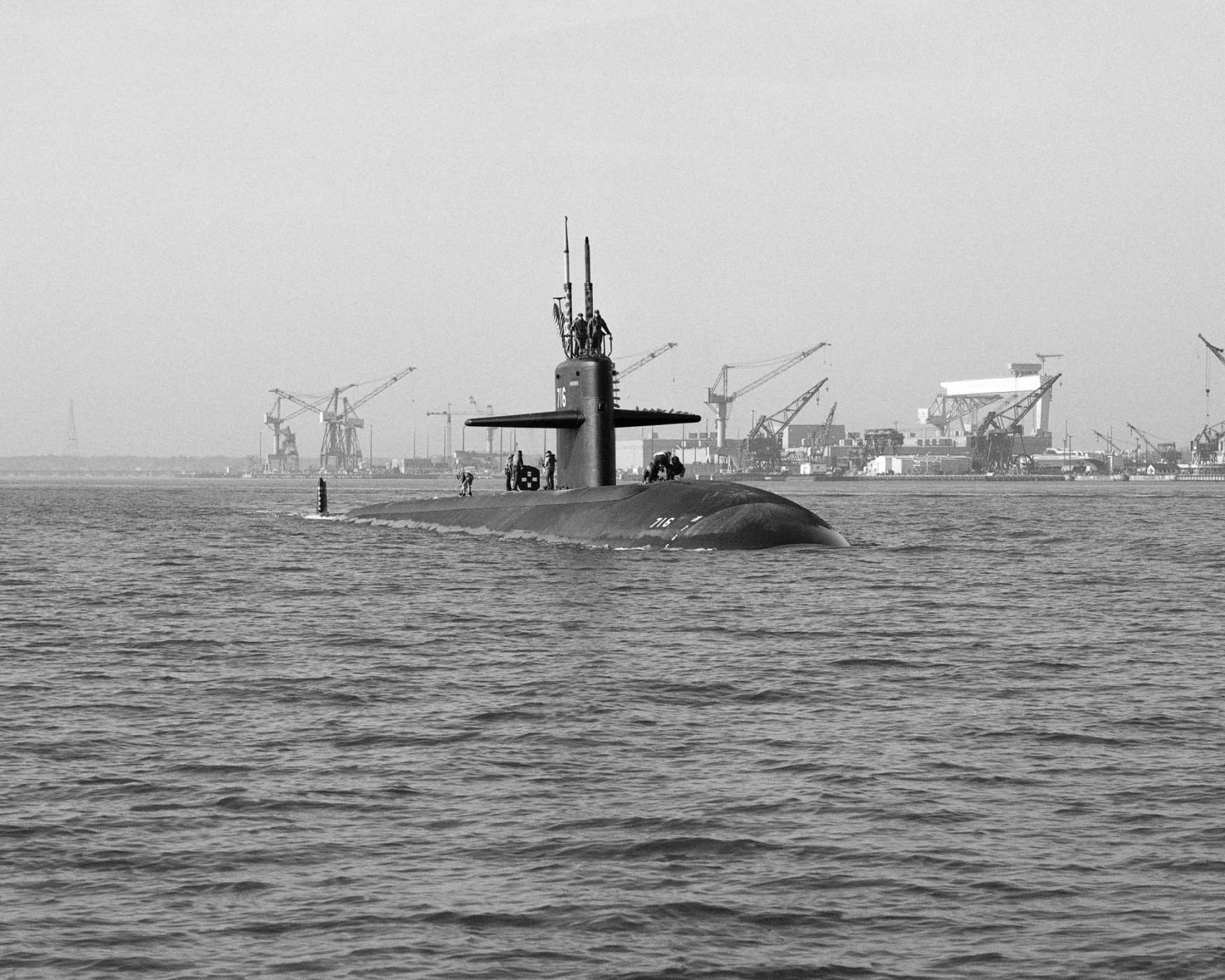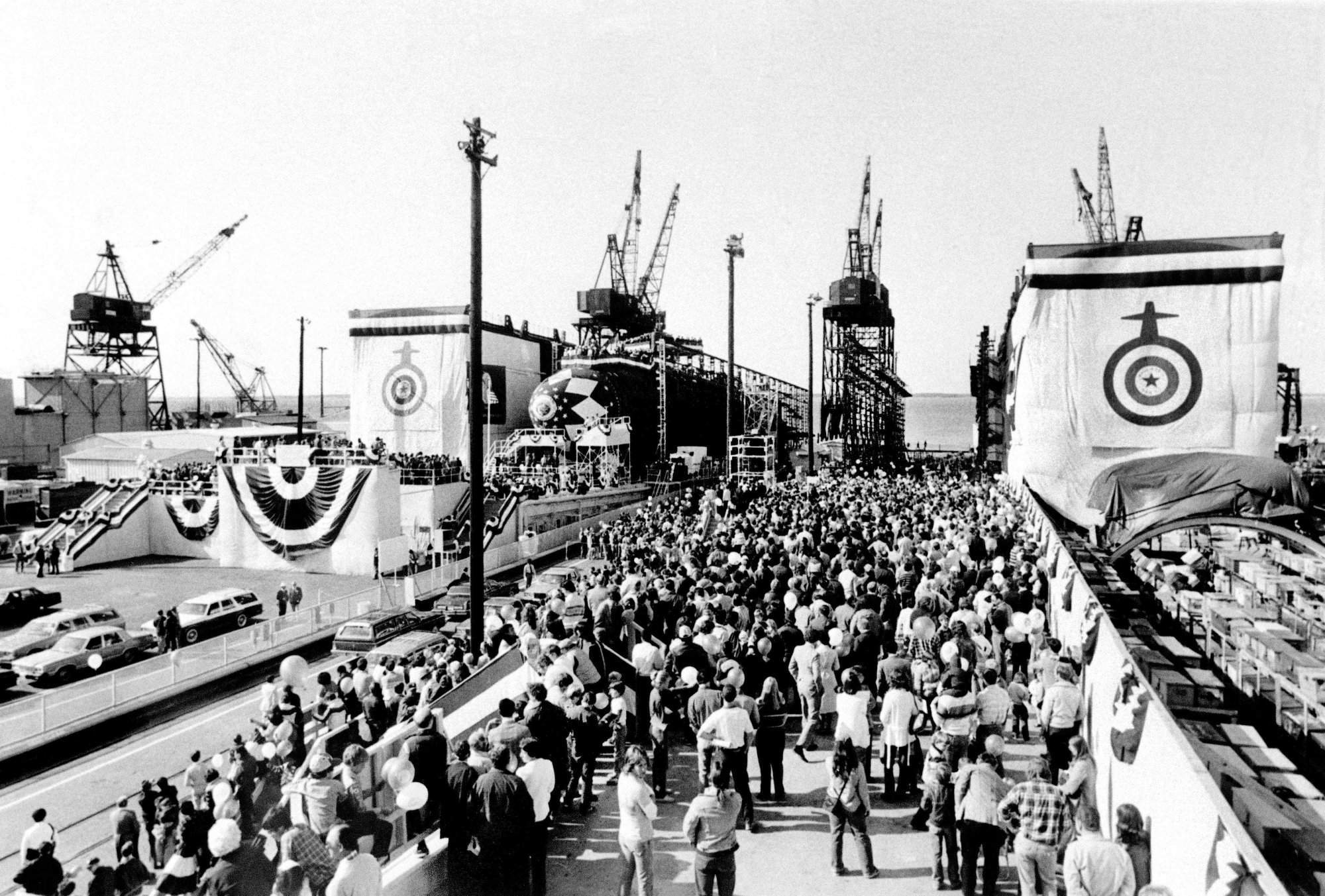 ![]() | 346k | A view of the spectators attending the launching ceremony for the nuclear-powered attack submarine Salt Lake City (SSN-716) on 16 October 1982. The unfinished Olympia (SSN-717) is on the building ways to the right. | USN photo # DN-SN-83-06085, by Stu Gilman, from the Department of Defense Still Media Collection, courtesy of dodmedia.osd.mil. | |