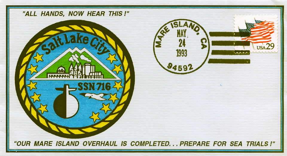 ![]() | 71k | Commemorative post mark on the occasion of Salt Lake City (SSN-716) finishing her overhaul at Mare Island, CA., on 24 May 1993. | Courtesy of Jack Treutle (of blessed memory). | |