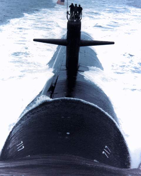 109k | Bow on view of the Olympia (SSN-717) underway, probably during her alpha sea trials off the Atlantic coast, 1984. | Contributed by Fabio Pena. | |