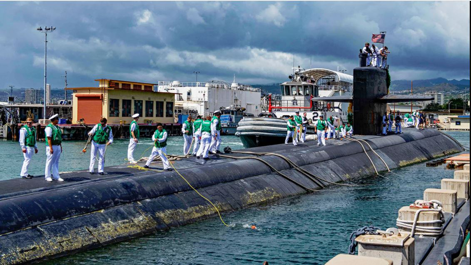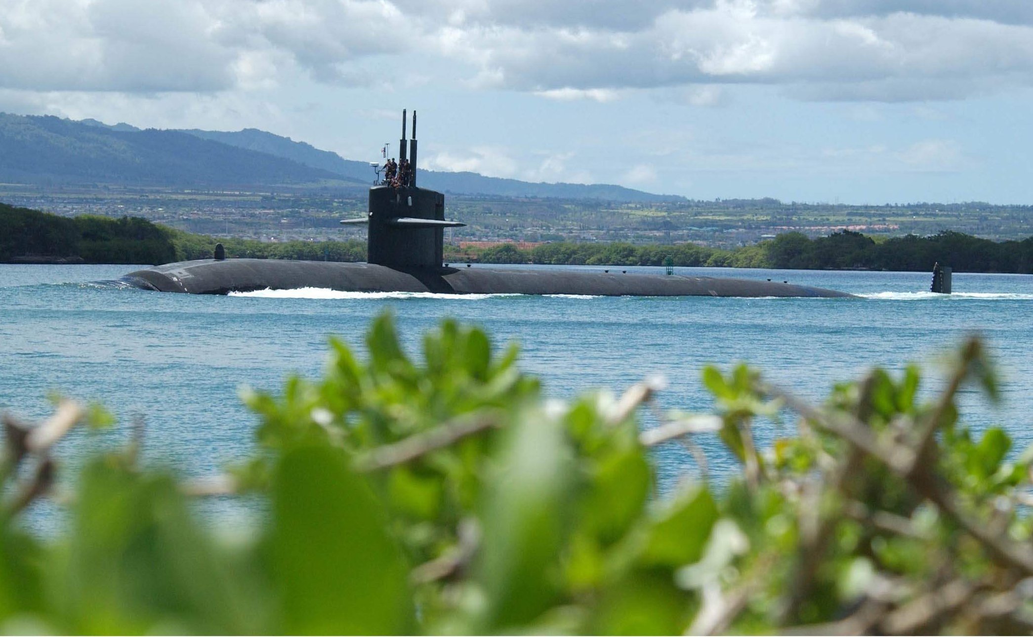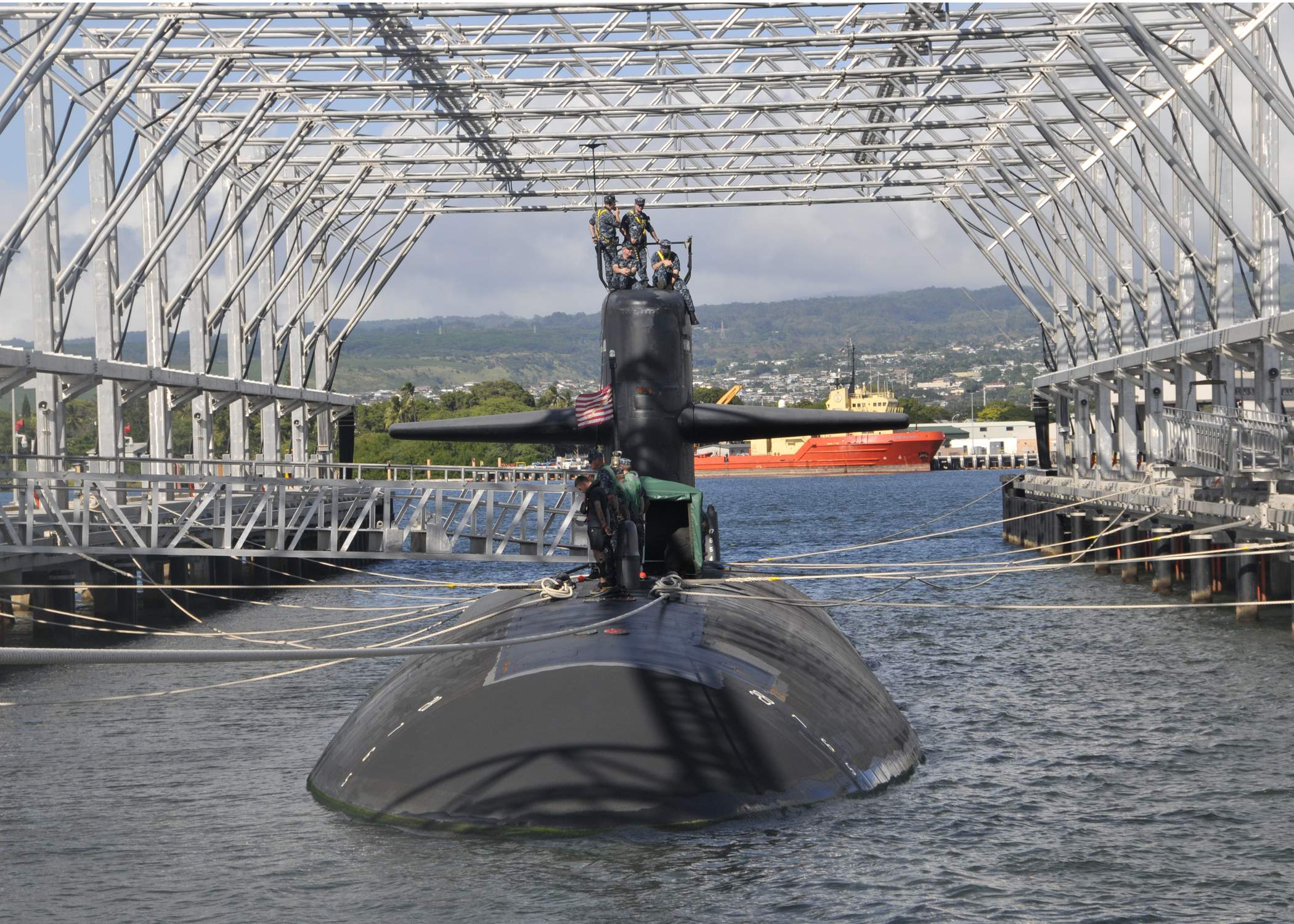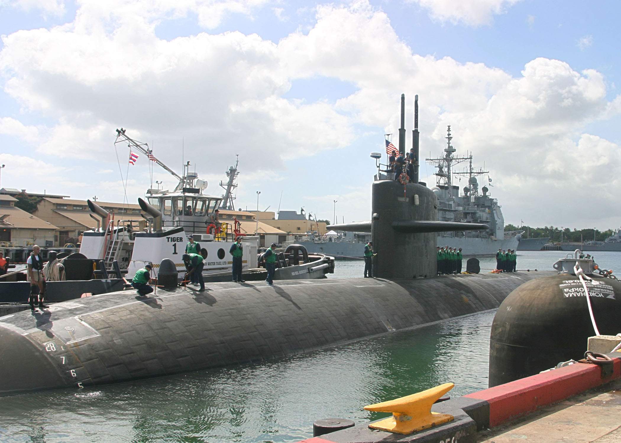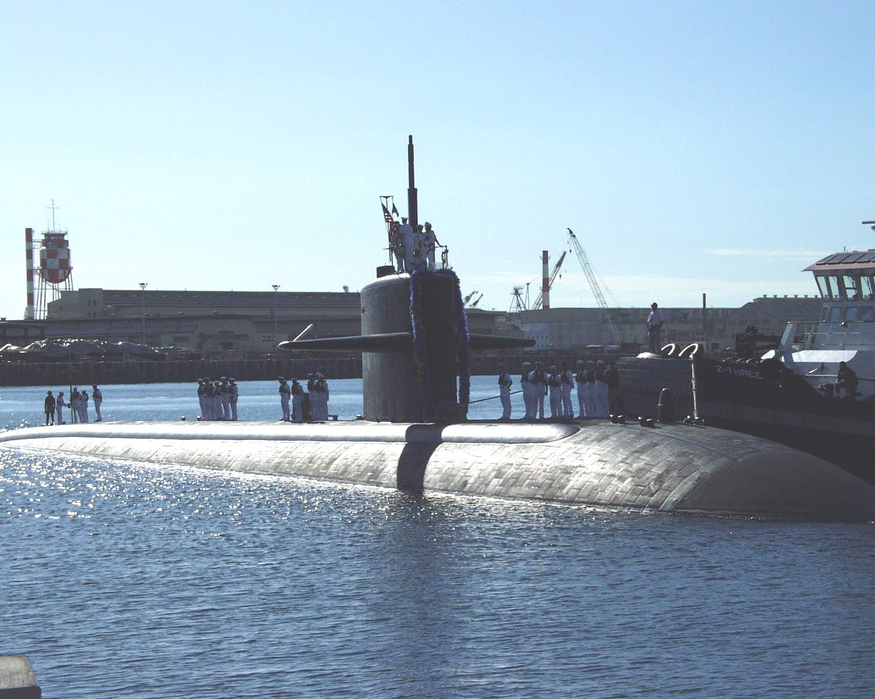 254k | The Tugz International Z-Three helps the Olympia (SSN-717) into Pearl Harbor. The Olympia returned to Pearl on 23 January 2002 after completing a six-month deployment to the Western Pacific in support of Operation Enduring Freedom. This was the first time the crew of the attack submarine had seen their loved ones since the September 11 attacks on the United States. "The beginning of the deployment was very stressful for the crew because of the 9/11 attacks," said Lt. James C. Statler, the Olympia Supply Officer. "But after we learned that we would be participating in Operation Enduring Freedom with Fifth Fleet, the crew became very focused and motivated to perform our missions at hand." | USN photo # P1230236, courtesy of cpf.navy.mil., submitted by Bill Gonyo. | |