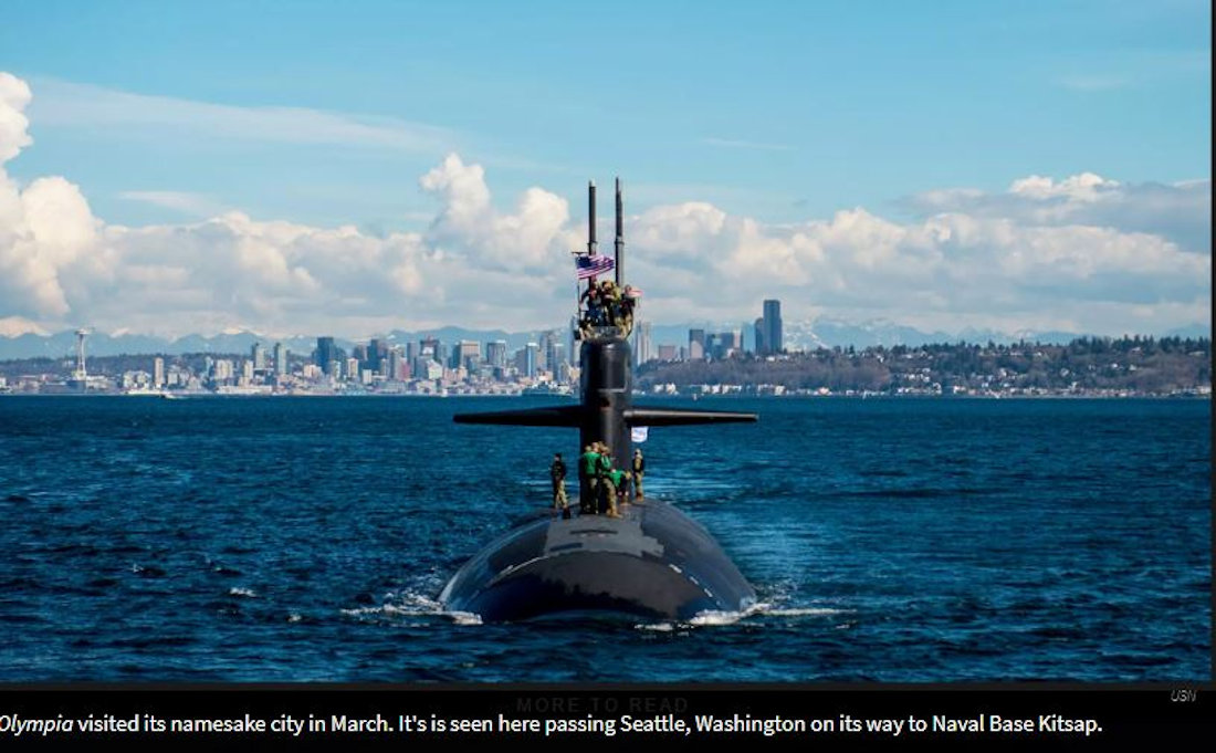 115k | Olympia (SSN-717) visited its namesake city in March 2018. It's is seen here passing Seattle, Washington on its way to Naval Base Kitsap. | Photo by Tyler Rogoway via thedrive.com courtesy of Thomas Lee. | |