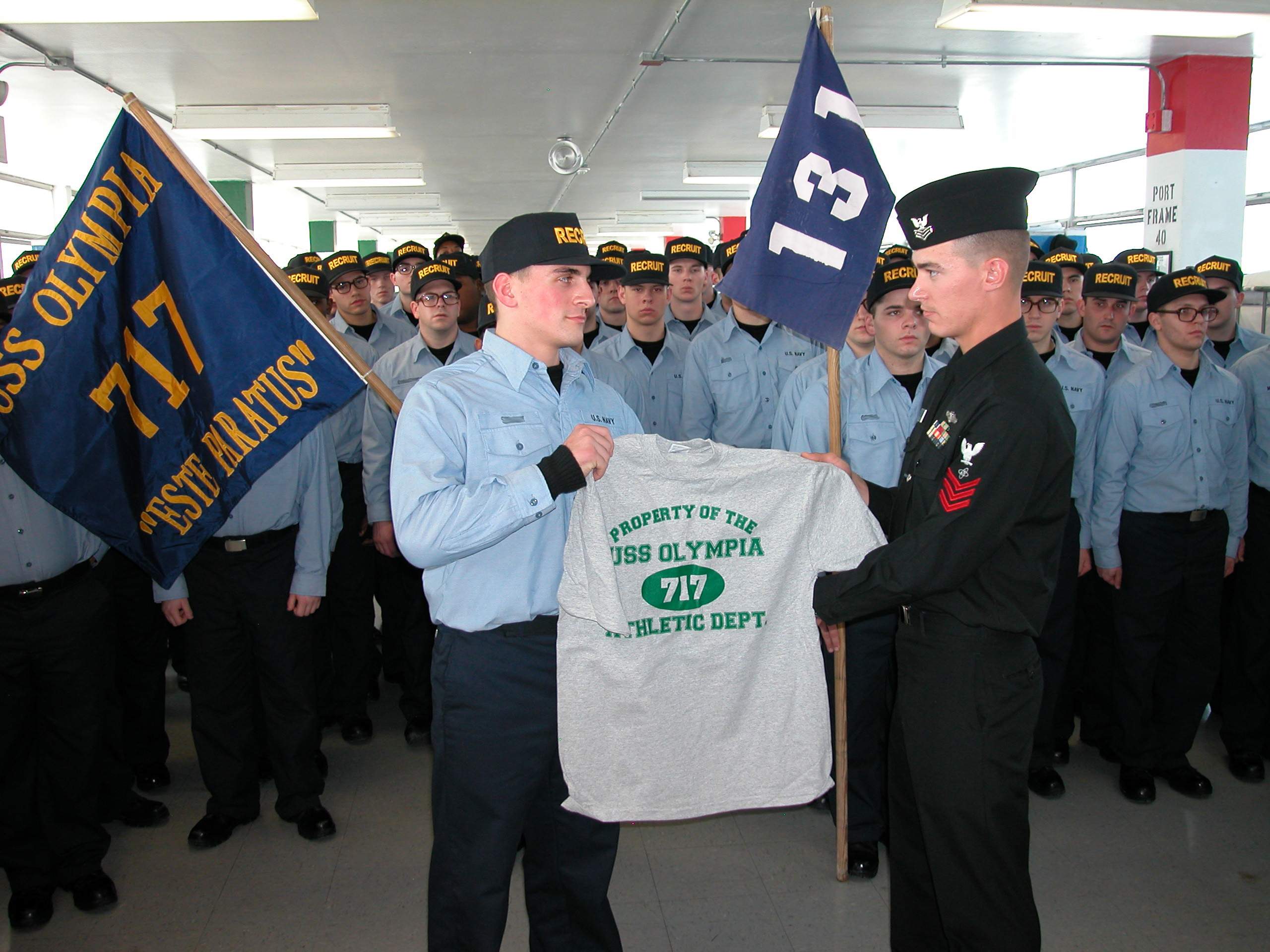 365k | An Electronics Technician 1st Class of Olympia (SSN-717) presents a Seaman Recruit with one of several items provided by the Los Angeles class nuclear-powered attack submarine homeported in Pearl Harbor. The submarine crew sponsored Great Lakes Recruit Training Command's Class 131 during a recent visit to the area on 1 March 2004. |