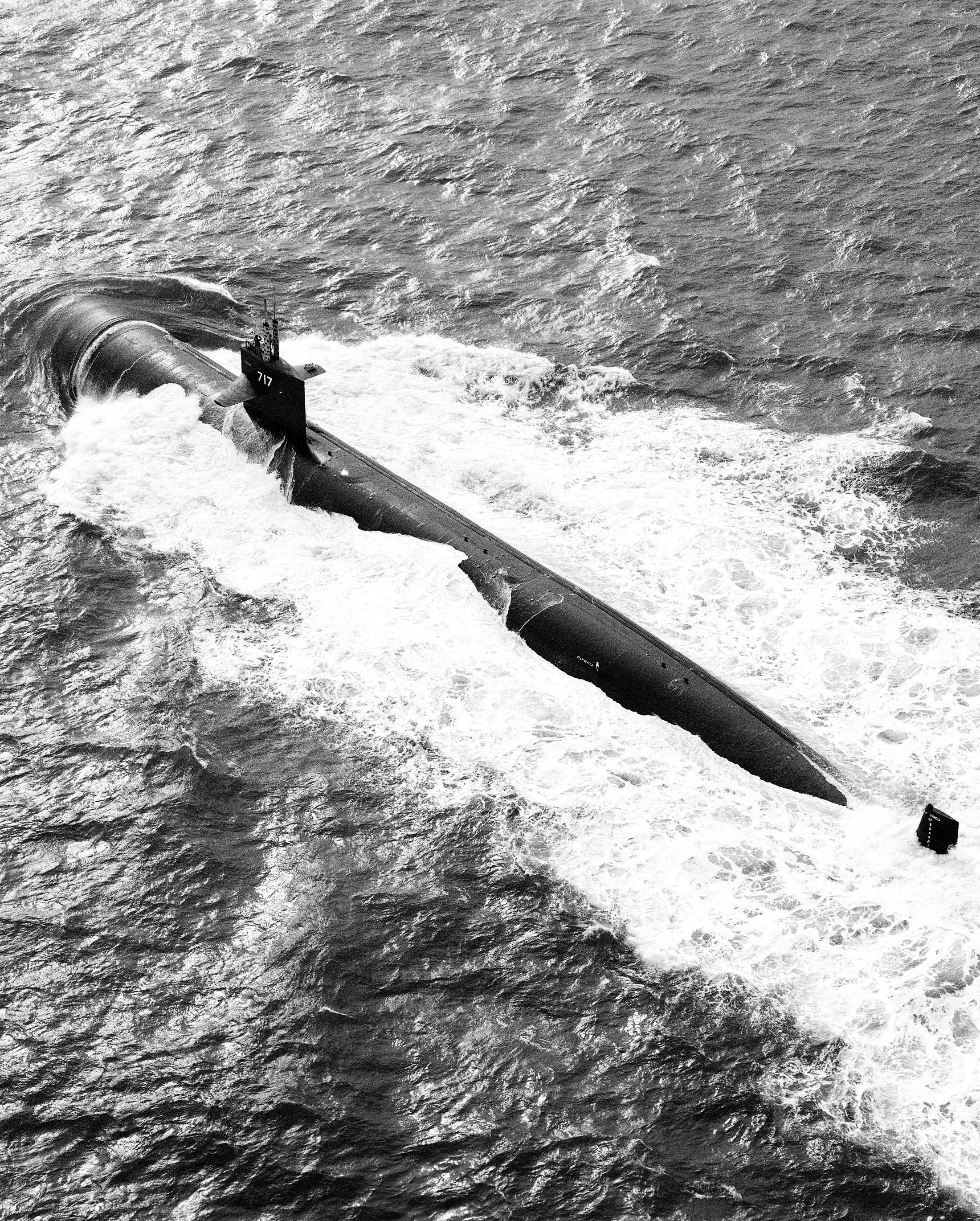 1.48k | An aerial port quarter view of the Olympia (SSN-717) underway, during her alpha sea trials off the Atlantic coast, 12 October 1984. | National Archives Identifier: 6395171 Agency-Assigned Identifier:DNSN8508311 Photo courtesy of catalog.archives.gov | |