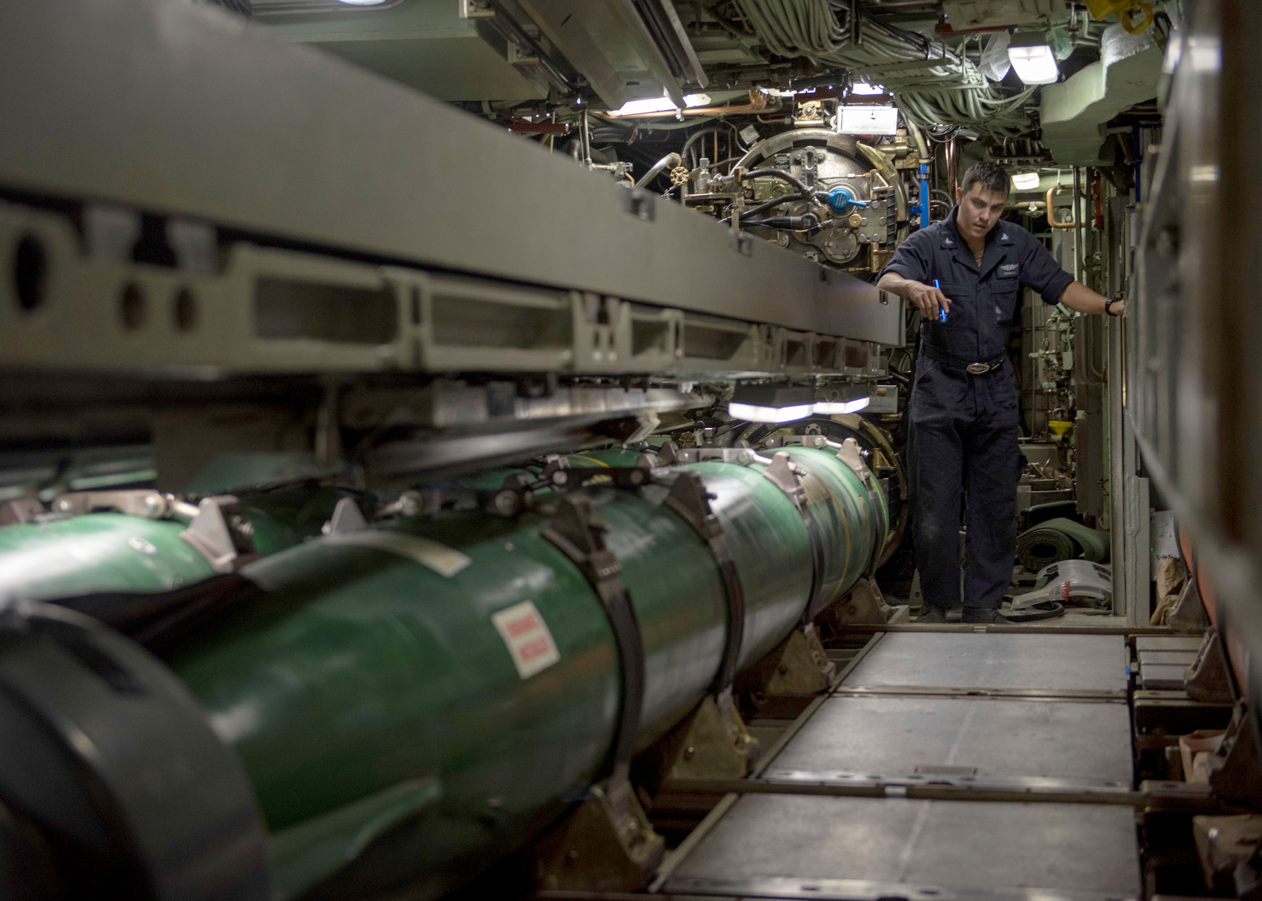 618k | Machinist's Mate (Weapons) 3rd Class Raul E. Bonilla, assigned to the fast-attack submarine Olympia (SSN-717), prepares to load a Mark 48 Advanced Capability (ADCAP) torpedo in Olympia's torpedo room for a sinking exercise during the 2018 Rim of the Pacific RIMPAC exercise, 12 July 2018. Multiple air, land, and sea assets sunk decommissioned ex-Racine (LST-1191) during the SINKEX. | USN photo 180712-N-LY160-0001 by Mass Communication Specialist 2nd Class Michael H. Lee, courtesy of | |