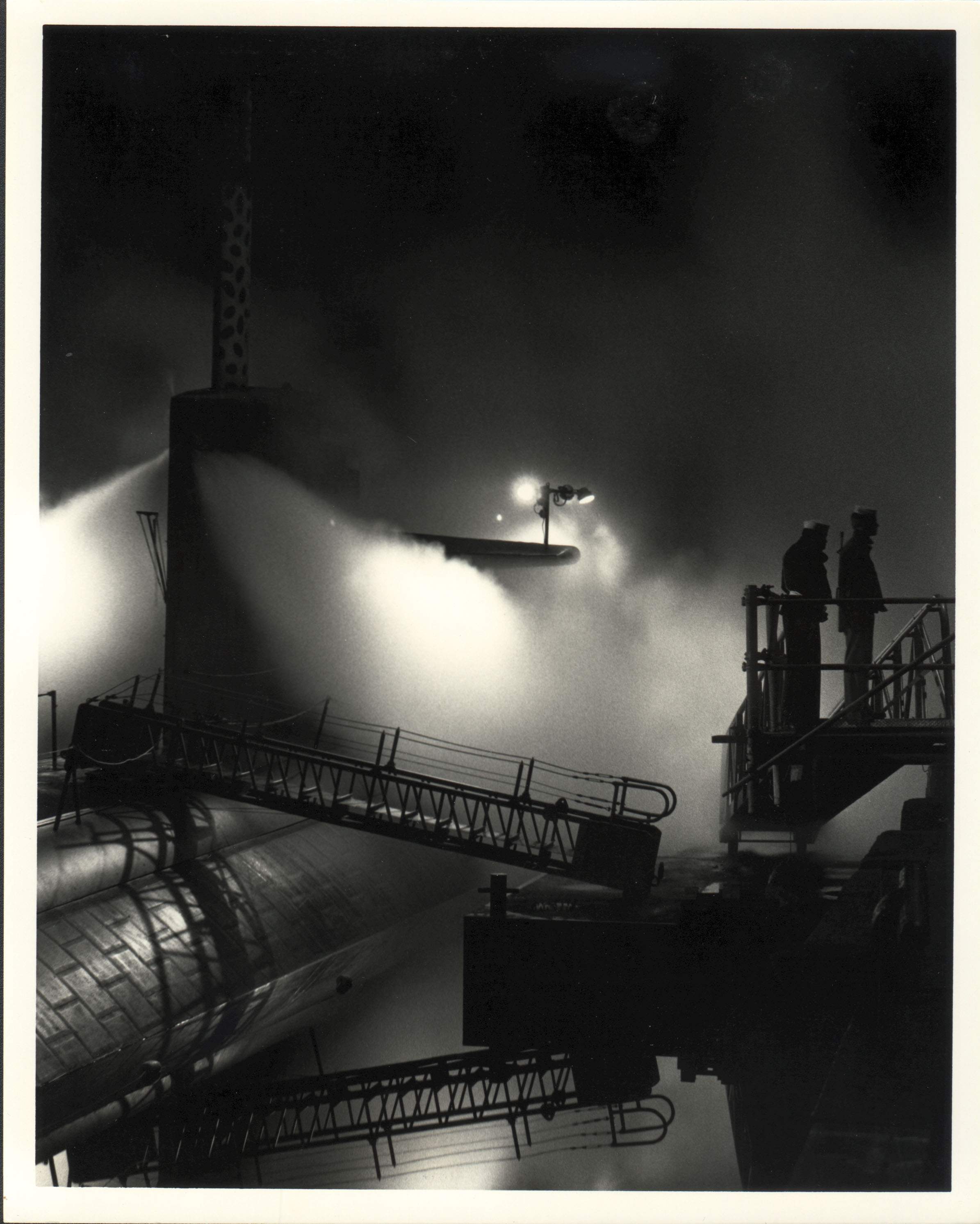 464k | Two crewmen stand watch aboard the Olympia (SSN-717) as she visits her namesake city for the first time, 17 March 1986. |