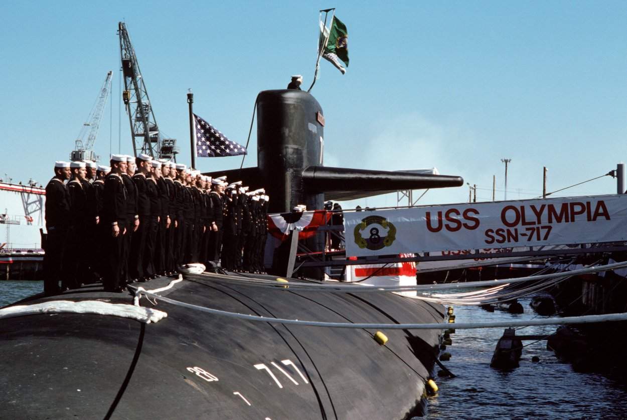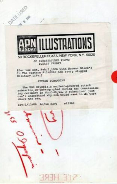 367k | 17 November 1984: The Olympia (SSN-717) a nuclear powered attack submarine, is photographed during her commissioning ceremony in Norfolk, VA. A submariner just can't understand why men would want to do work above the sea. | A.P. Wirephoto courtesy of Tommy Trampp. | |