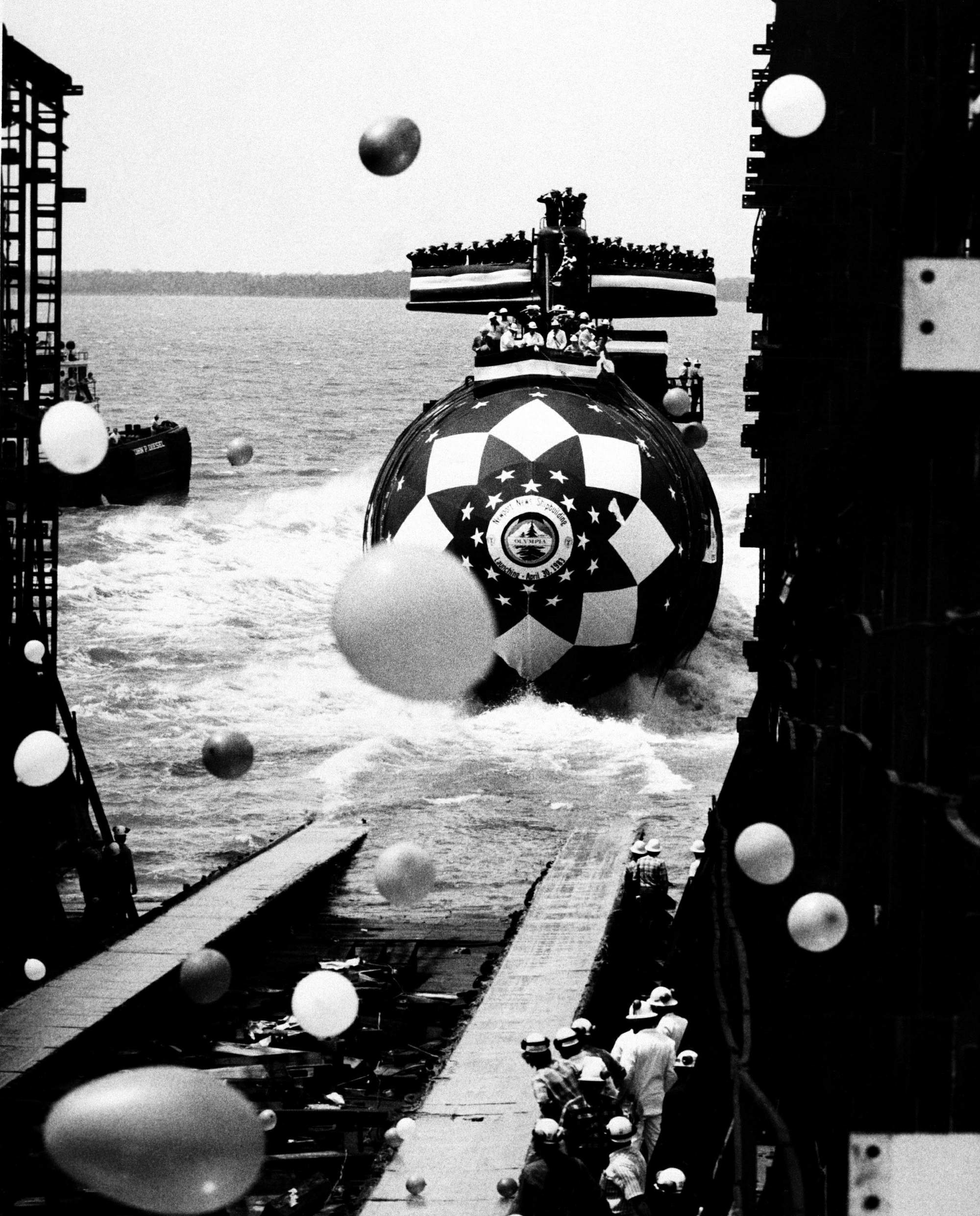 490k | Olympia (SSN-717) slides down the ways into the water during launching ceremonies. Balloons are released in the foreground, 30 April 1983. | National Archives Identifier: 6371113 Agency-Assigned Identifier:DNSN8308860 Photo courtesy of catalog.archives.gov | |