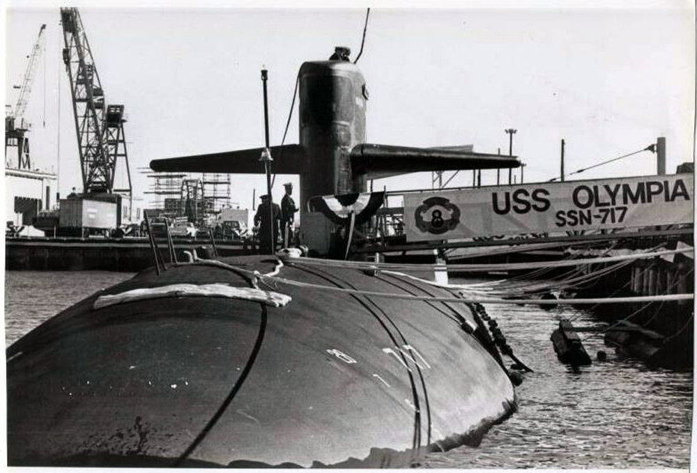 104k | The Olympia (SSN-717) is tied up to a wharf outside of her namesake city for the first time, 17 March 1986. |