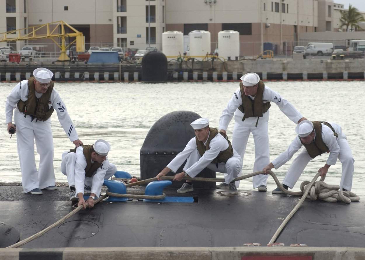 ![]() | 104k | Linehandlers aboard the Key West (SSN-722) secure the submarine's mooring lines after arriving in their homeport of Pearl Harbor on 24 July 2003. | USN photo # N-5376G-011, by Photographer's Mate Airman Benjamin D. Glass, courtesy of NAVCHINFO web site. | |