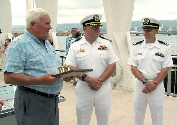 ![]() | 51k | Naval Submarine League President Aloha Chapter Capt. Robert Morrison, USN (Retired) presents the Admiral Bernard Clarey Award to Cmdr. Chuck Merkel, Key West (SSN-722) commanding officer. Lt. j.g. Michael Doniger received the Captain Charles Rush Award at Pearl Harbor, Hawaii on 28 July 2003. Both war-fighting awards were presented at the Arizona Memorial. Key West recently returned from deployment in support of Operation Iraqi Freedom. | USN photo # N-0879R-004, by Chief Journalist David Rush, courtesy of news.navy.mil. | |