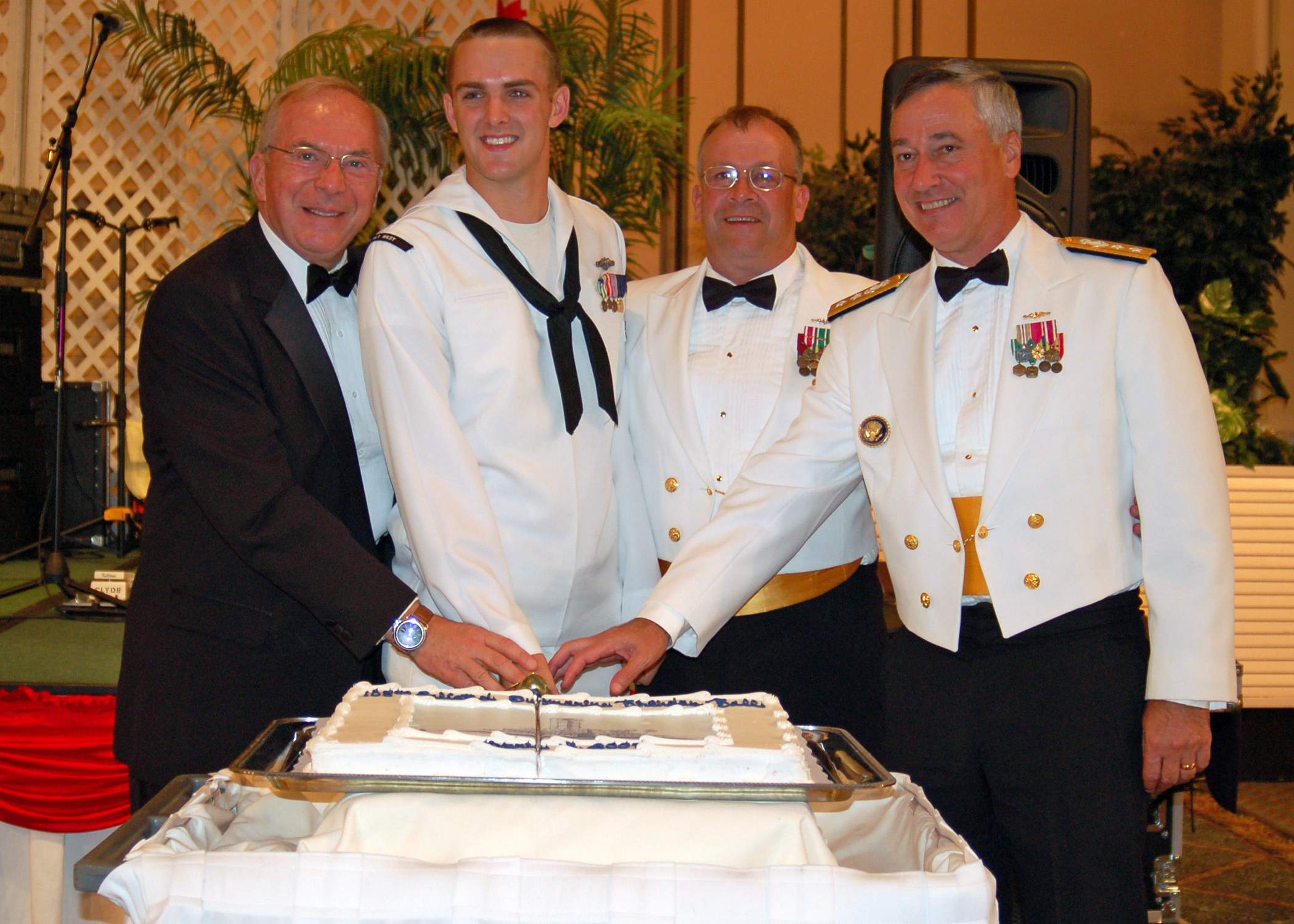 ![]() | 261k | Commander, Submarine Force U.S. Pacific Fleet Rear Admiral Joe Walsh and Retired Vice Admiral Al Konetzni join in as the longest submarine qualified Sailor in attendance, Submarine Force U.S. Pacific Fleet Force Master Chief (SS) Morris Pollard and the most recent submarine qualified Sailor in attendance, Machinist Mate 2nd Class (SS) Kevin Pallagi from the Key West (SSN-722) cut the birthday cake at the 108th Enlisted Submarine Ball, Friday, 19 April 2008, held in the Coral Ballroom at the Hilton Hawaiian Village. More than 1,000 Submariners and their guests from all over the Hawaii area joined together to celebrate the 108th birthday of the Submarine Force. | USN photo # N-9486C-003 by Mass Communications Specialist First Class (SW) Cynthia Clark, courtesy of news.navy.mil. & submitted by Bill Gonyo. | |