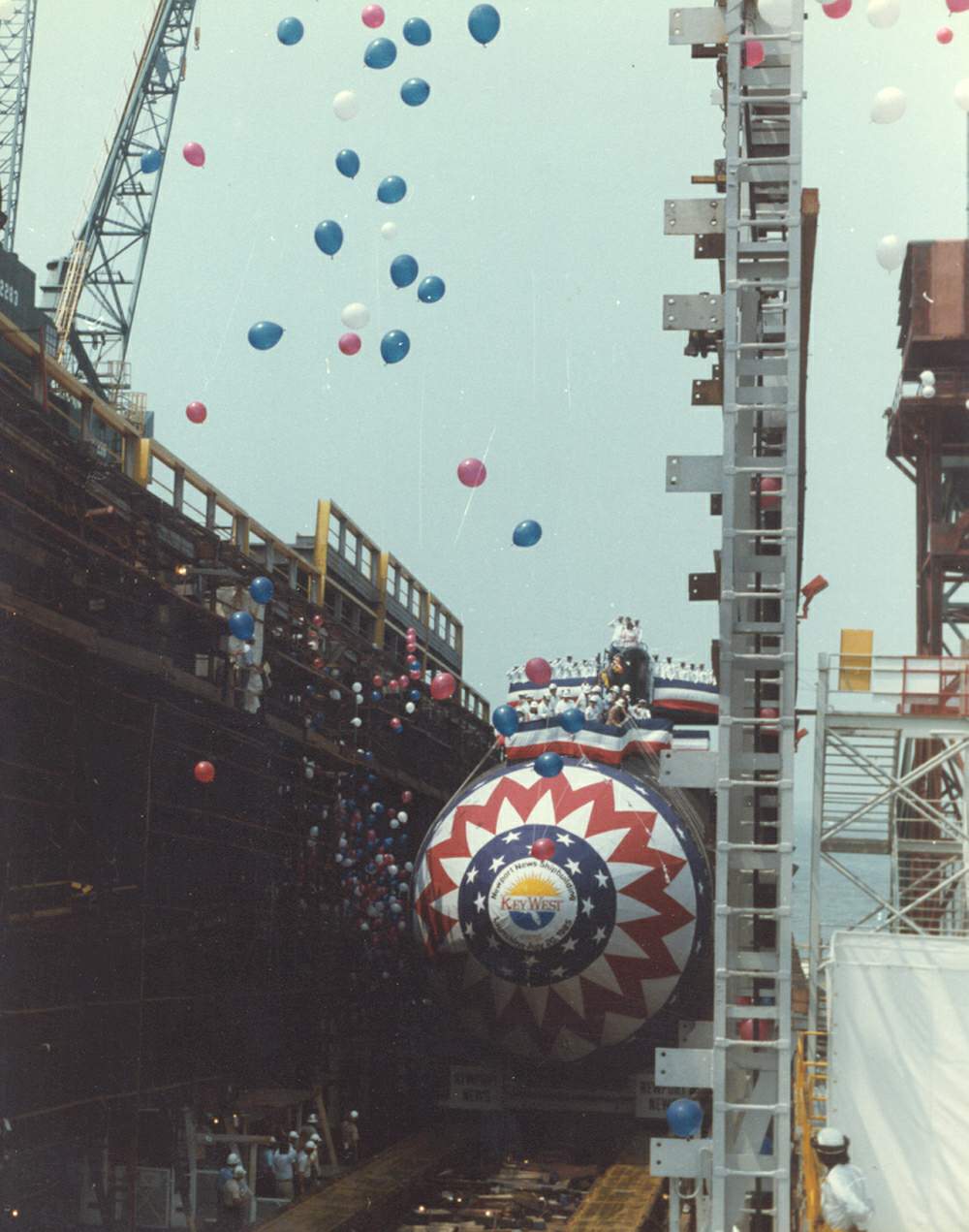 ![]() | 113k | The nuclear-powered attack submarine Key West (SSN-722) slides down the ways after being launched at Newport News Shipbuilding & Dry Dock Co., Newport News, VA. on 20 July 1985. | Photo courtesy of Scott Koen & ussnewyork.com. | |