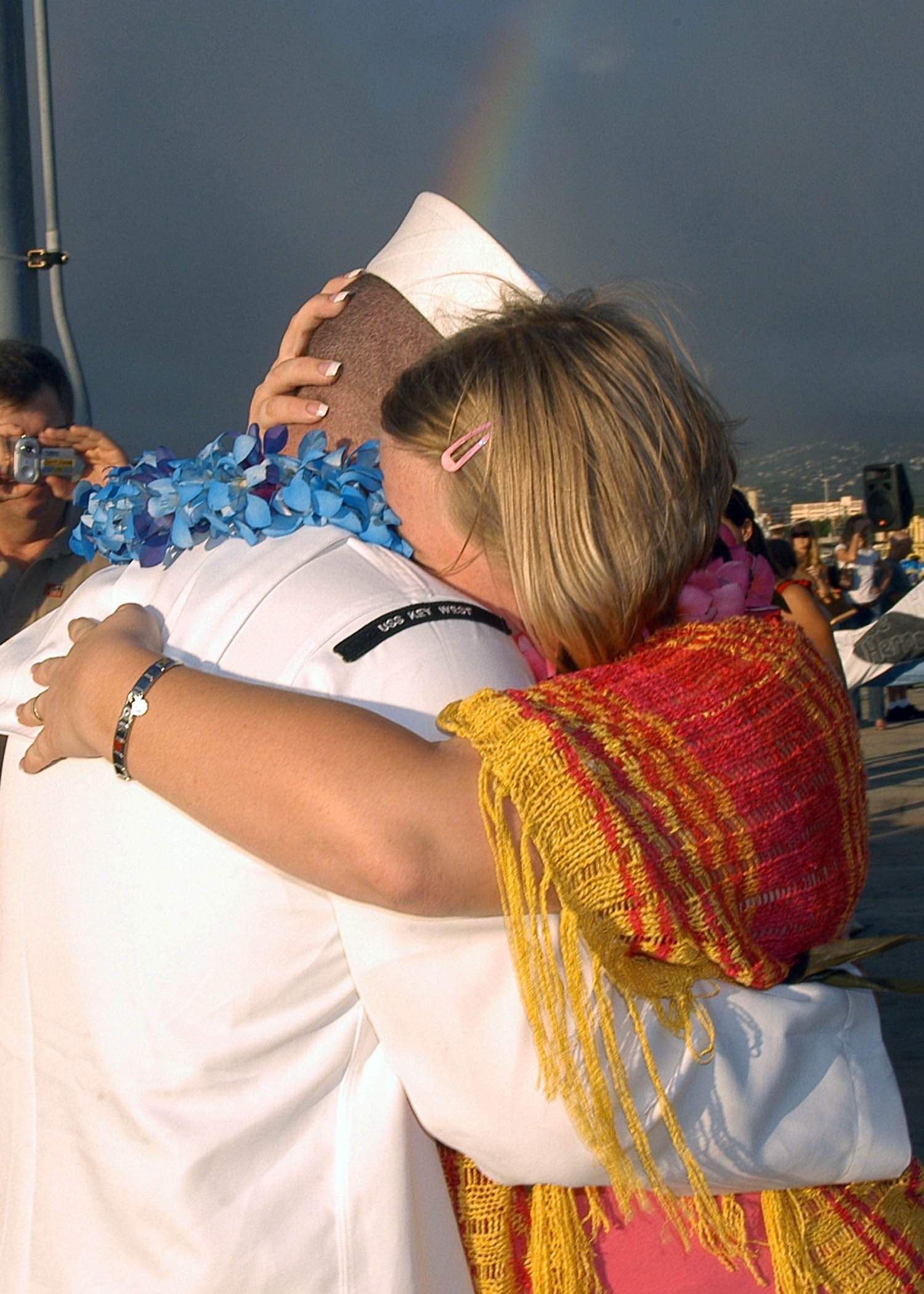 ![]() | 240k | Torpedoman's Mate 3rd Class Ernest R. Williams, assigned to the Key West (SSN-722), embraces his wife after returning home to Pearl Harbor, Hawaii after a regularly scheduled deployment. | USN photo # N-4995T-186, by Photographer's Mate 3rd Class Victoria A. Tullock, courtesy of news.navy.mil. | |