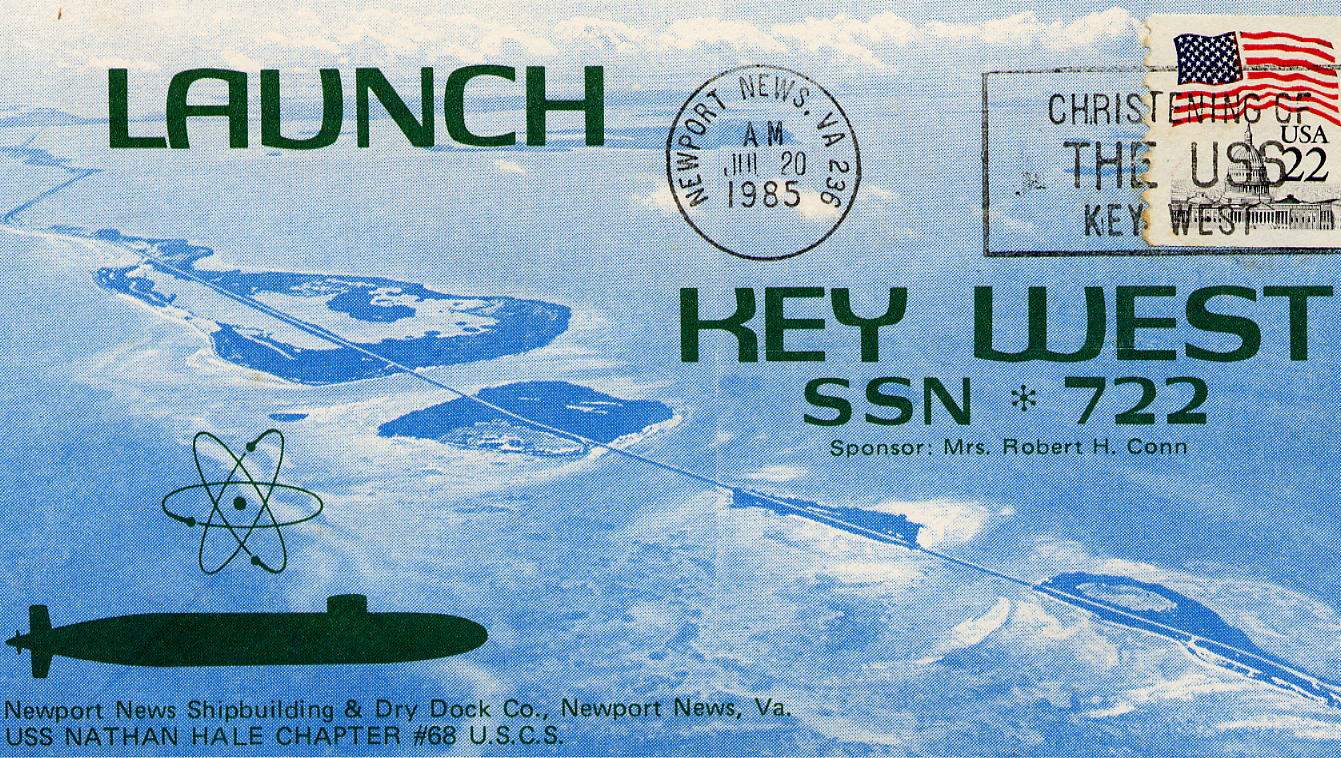 ![]() | 149k | Key West (SSN-722) launch cachet, 20 July 1985. | Photo courtesy of Scott Koen & ussnewyork.com. | |