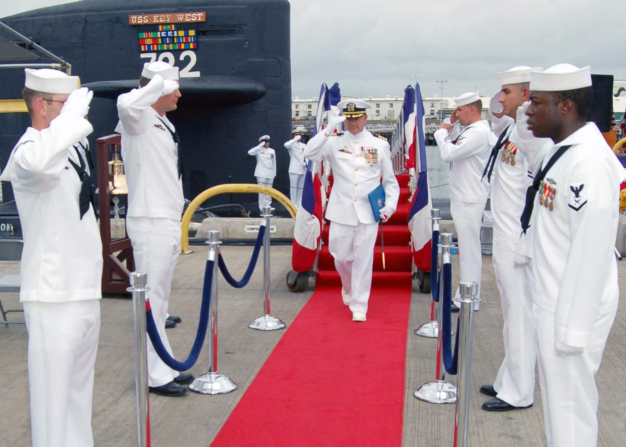 ![]() | 233k | Key West (SSN-722) sailors salute as sideboys, after Cmdr. Thomas E. Ishee relieves Capt. Kenneth R. Sault as commanding officer, Pearl Harbor, Hawaii, 14 March 2006. | USN photo # N-0879R-001, by Chief Journalist David Rush, courtesy of news.navy.mil. | |