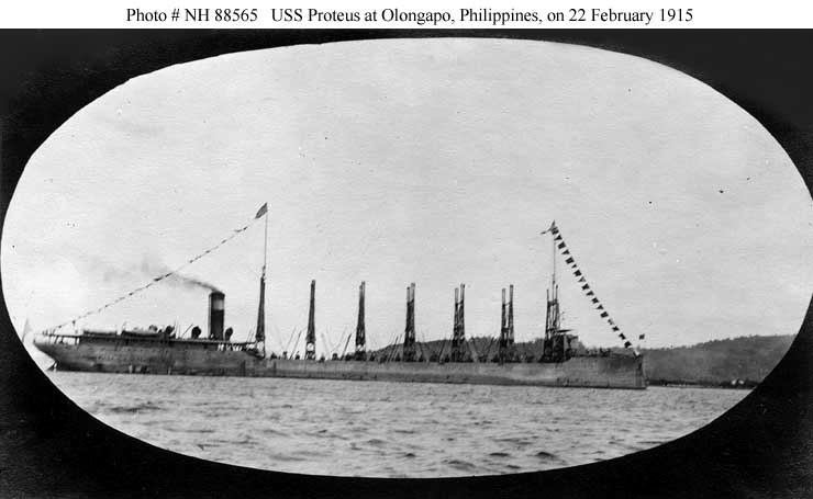 45k | Starboard broadside view of USS Proteus (Fuel Ship #9) anchored at Olongapo, Philippines, 22 February 1915. Note flags in