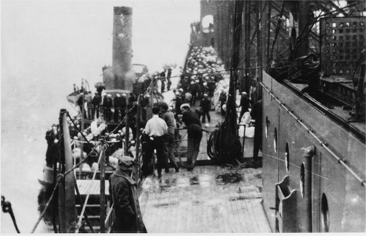 154k | USS Proteus (Fuel Ship #9) loading personnel drafts in 1915 for a Far East cruise.