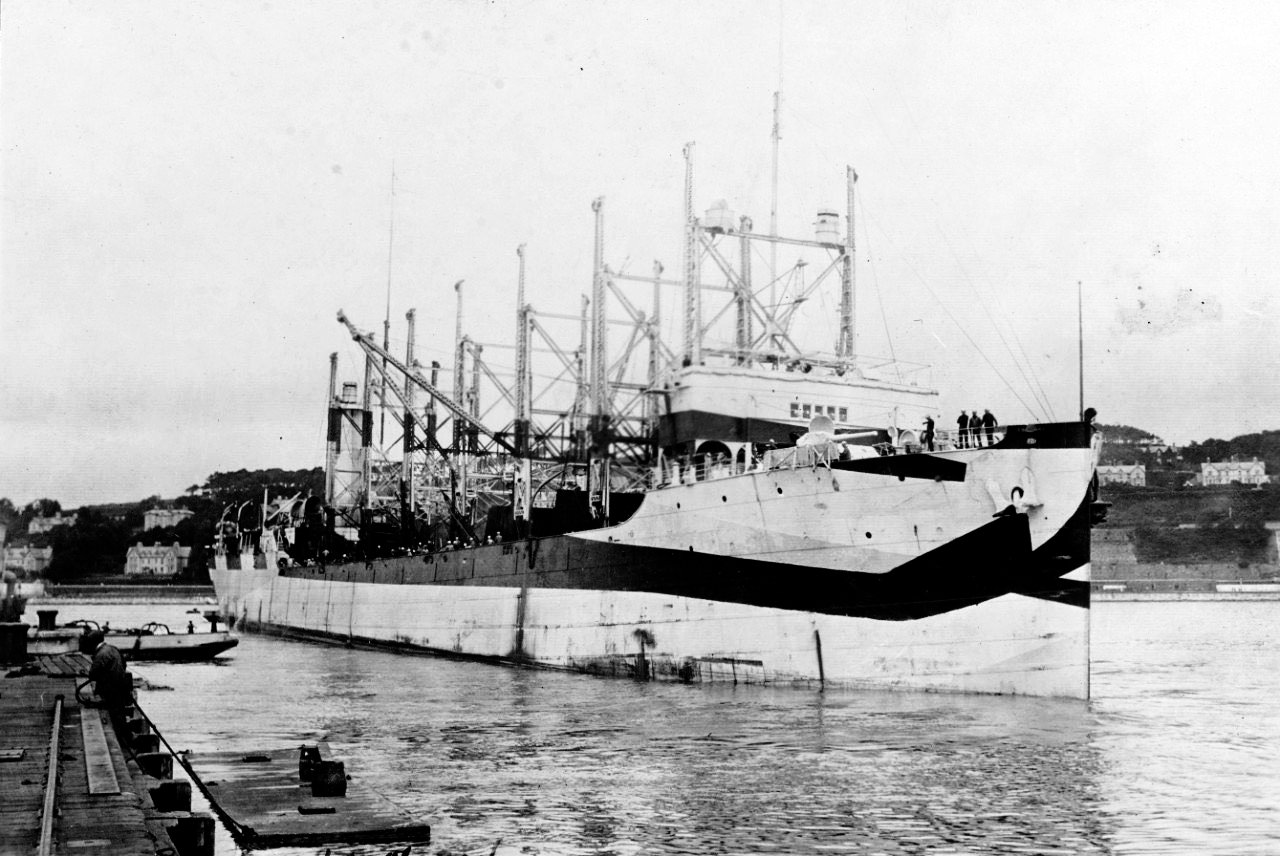 194k | USS Proteus (Fuel Ship #9) going alongside a pier at Queenstown, Ireland, during World War I. Note her dazzle camouflage scheme.
