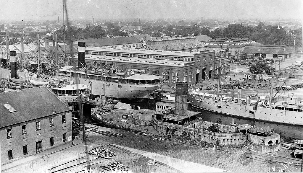226k | A 1918 view of Norfolk Navy Yard, Portsmouth, VA. At left is USS Kanawha (Fuel Ship #13),