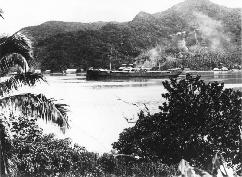 195k | USS Abarenda (Collier #13) anchored at Pago Pago, Samoa, circa 1899. Note Mt. Peiva in the background.