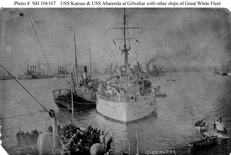 79k | USS Abarenda (Collier #13) alongside USS Kansas (Battleship #21) at Gibraltar, circa late January or early February 1909. The original image is printed on postcard stock. US Navy photo # NH 106167 from the collections of the US Naval Historical Center, donation of Mrs. Ruth Mayfield, 1973. |