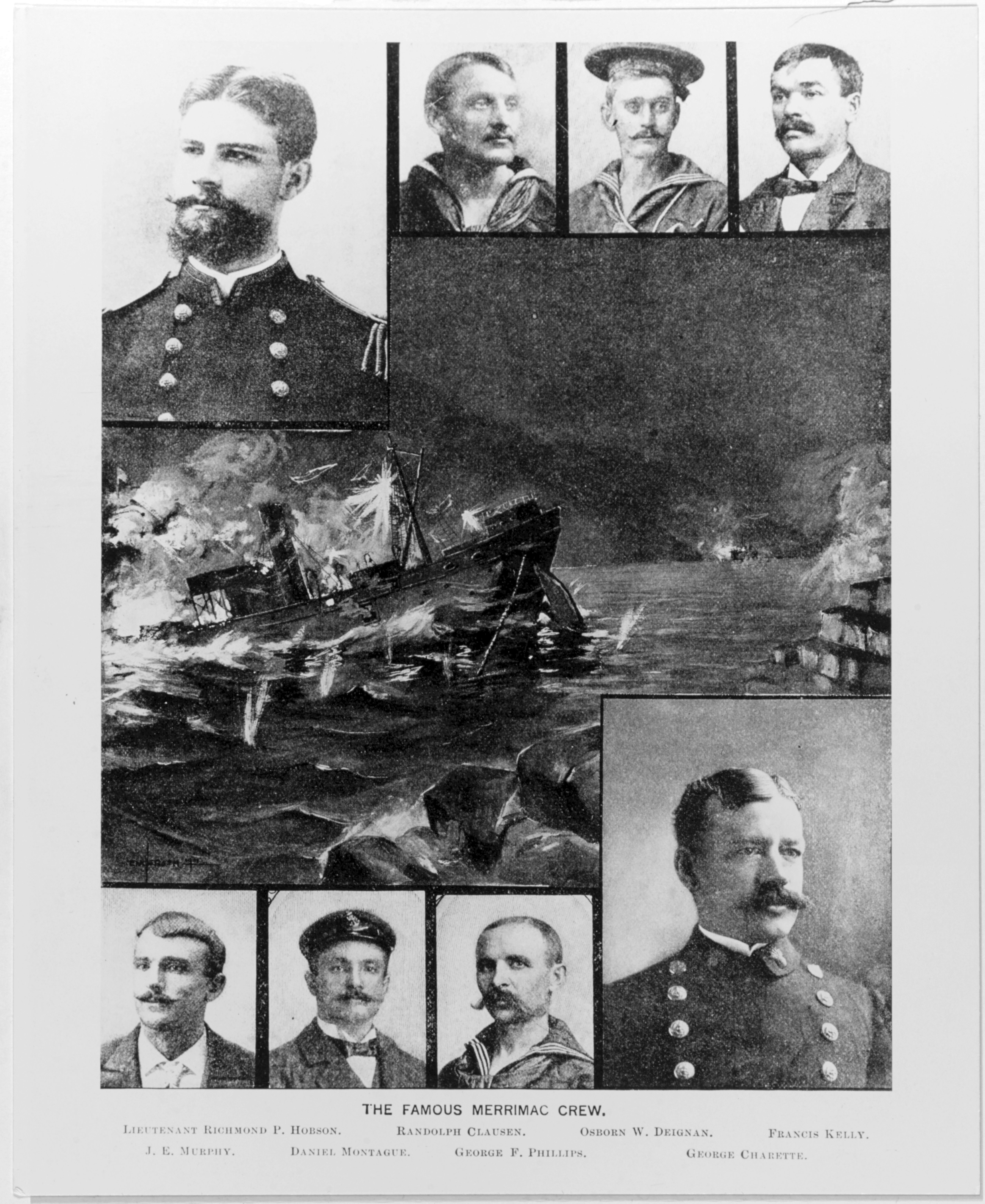 image shows an artistic interpretation of the scuttling of USS Merrimac across the entrance of Santiago Harbor, Cuba, with portraits of her crew on this