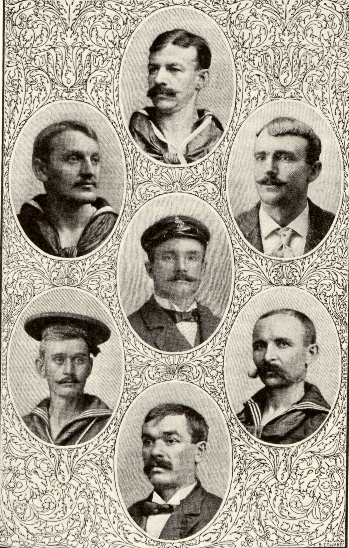 mission. The crew members from upper left to right are Lieutenant Richmond P. Hobson, Coxswain Claus K. R. Clausen (note: official sources state Clausen's first name to