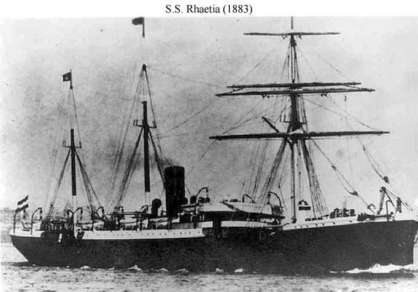 Hamburg American Line emigrant steamer, SS Rhaetia underway prior to acquisition by the US Navy in 1898. Source: